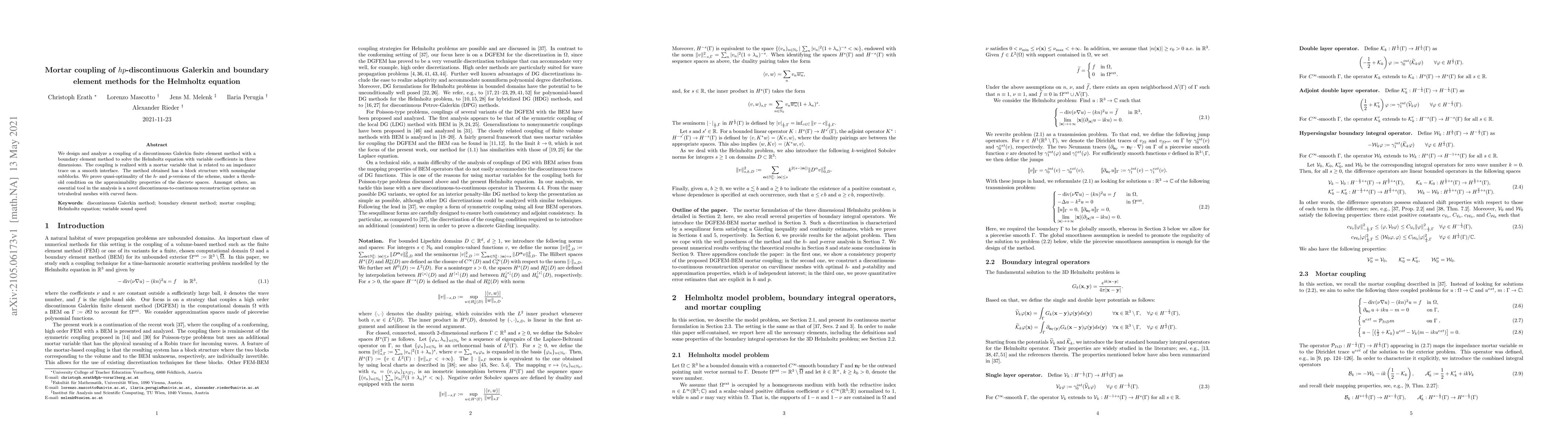 We design and analyze a coupling of a discontinuous Galerkin finite element method with a boundary element method to solve the Helmholtz equation with variable coefficients in three dimensions. The coupling is realized with a mortar variable that is related to an impedance trace on a smooth interface. The method obtained has a block structure with nonsingular subblocks. We prove quasi-optimality of the $h$- and $p$-versions of the scheme, under a threshold condition on the approximability properties of the discrete spaces. Amongst others, an essential tool in the analysis is a novel discontinuous-to-continuous reconstruction operator on tetrahedral meshes with curved faces.