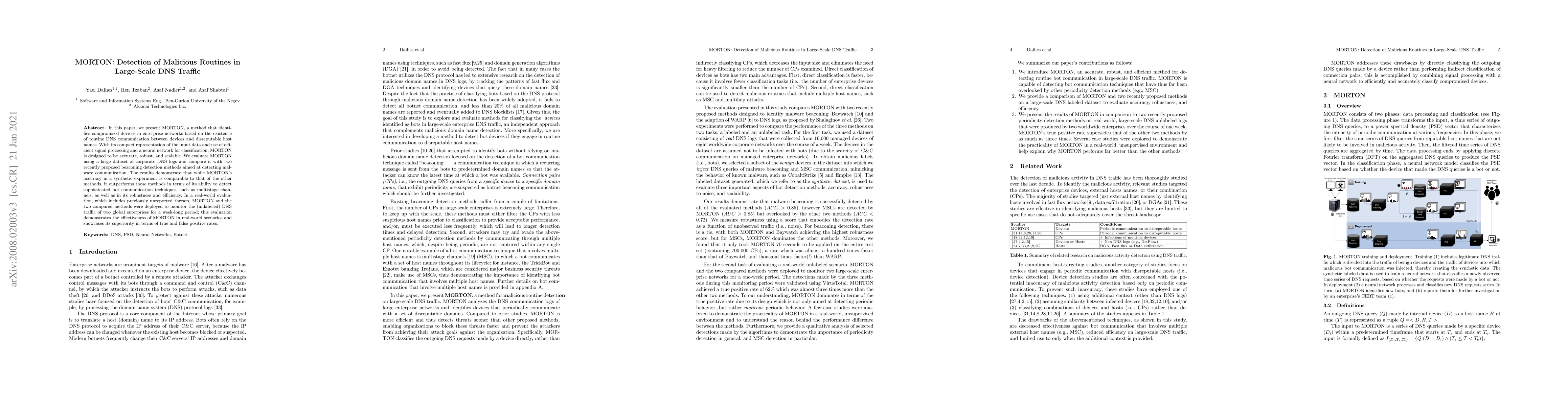 In this paper, we present MORTON, a method that identifies compromised devices in enterprise networks based on the existence of routine DNS communication between devices and disreputable host names. With its compact representation of the input data and use of efficient signal processing and a neural network for classification, MORTON is designed to be accurate, robust, and scalable. We evaluate MORTON using a large dataset of corporate DNS logs and compare it with two recently proposed beaconing detection methods aimed at detecting malware communication. The results demonstrate that while MORTON's accuracy in a synthetic experiment is comparable to that of the other methods, it outperforms those methods in terms of its ability to detect sophisticated bot communication techniques, such as multistage channels, as well as in its robustness and efficiency. In a real-world evaluation, which includes previously unreported threats, MORTON and the two compared methods were deployed to monitor the (unlabeled) DNS traffic of two global enterprises for a week-long period; this evaluation demonstrates the effectiveness of MORTON in real-world scenarios and showcases its superiority in terms of true and false positive rates.