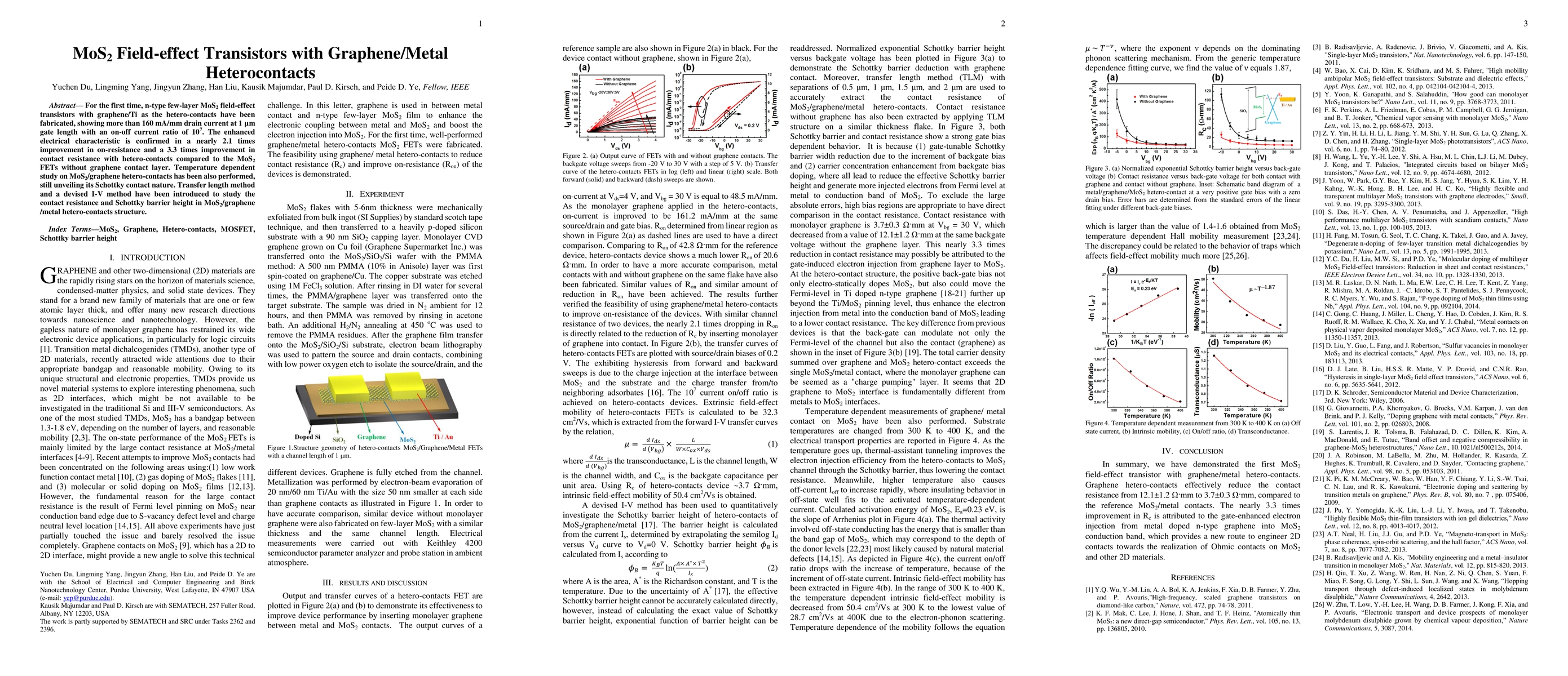 This study fabricates n-type few-layer MoS2 field-effect transistors utilizing graphene/Ti hetero-contacts, achieving significant improvements in drain current and on-off current ratio. The hetero-contacts demonstrate a 2.1 times reduction in on-resistance and a 3.3 times reduction in contact resistance compared to conventional contacts, maintaining Schottky contact nature even under temperature variations.