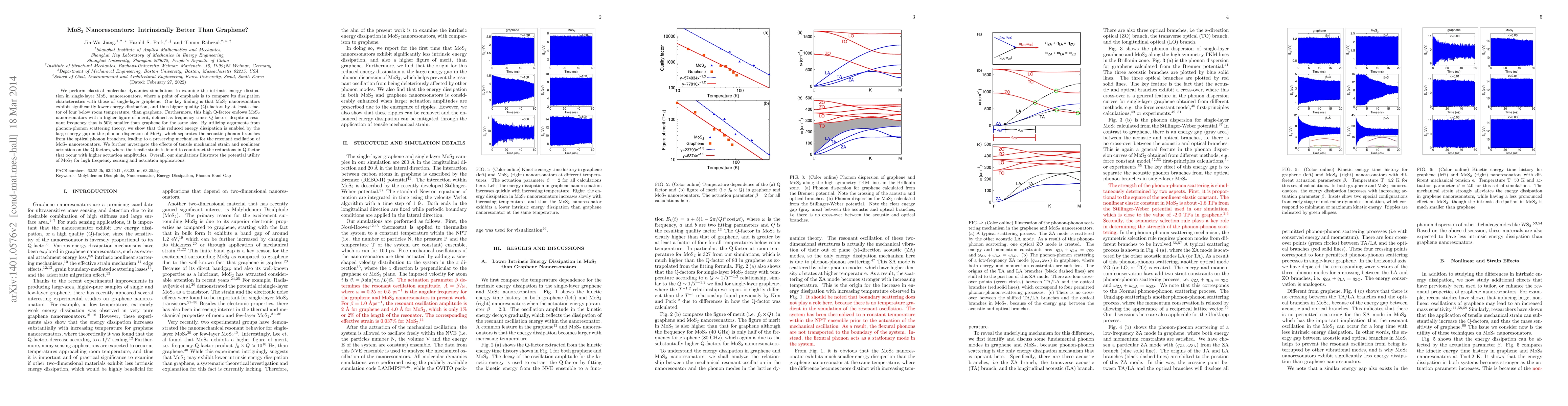 MoS$_2$ nanoresonators demonstrate significantly lower energy dissipation and higher quality factors compared to graphene, primarily due to a large energy gap in phonon dispersion, suggesting superior performance in high-frequency sensing and actuation applications. Tensile strain can mitigate reductions in quality factors caused by higher actuation amplitudes.
