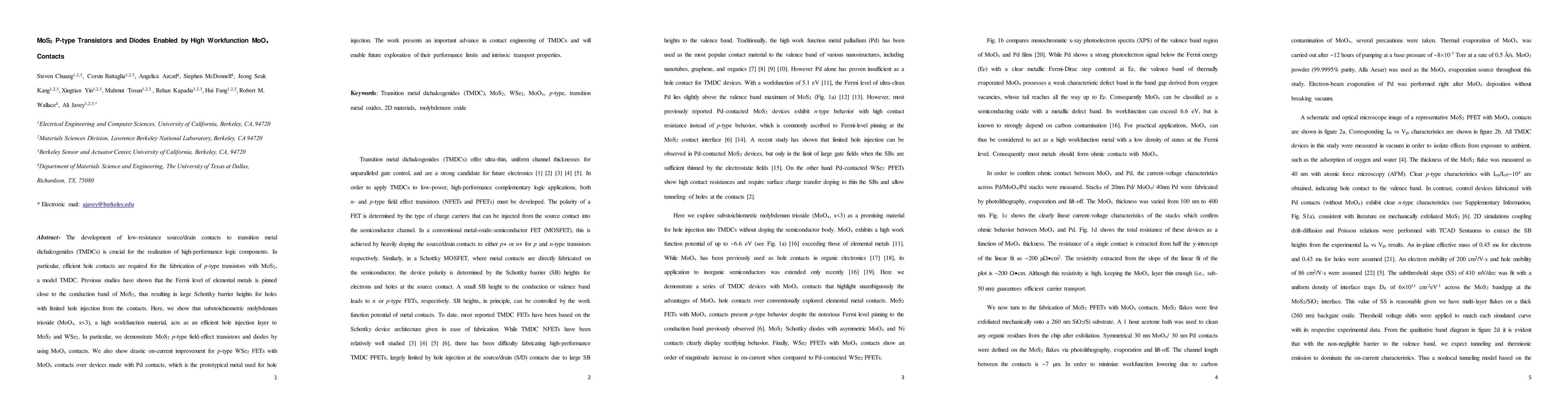 This paper presents the use of high workfunction MoOx contacts to create efficient p-type field-effect transistors and diodes in MoS2 and WSe2, significantly improving on-current performance compared to traditional Pd contacts. This advance in contact engineering for transition metal dichalcogenides could pave the way for high-performance logic components.