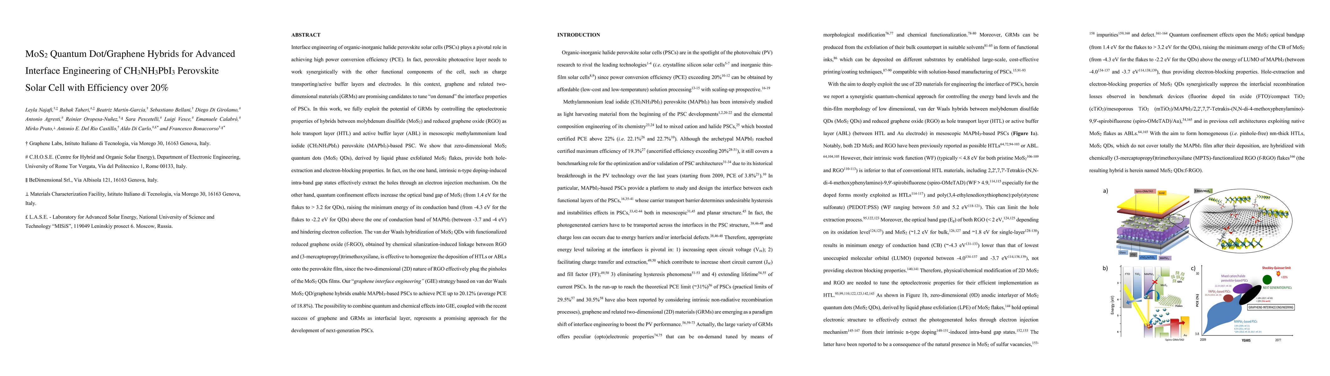 This paper explores the use of MoS2 quantum dots/graphene hybrids to enhance the interface engineering of perovskite solar cells, achieving a power conversion efficiency of over 20%. The MoS2 quantum dots provide hole extraction and electron blocking, while the graphene hybridizes to form a seamless layer, resulting in a high-efficiency solar cell with an average efficiency of 18.8%.