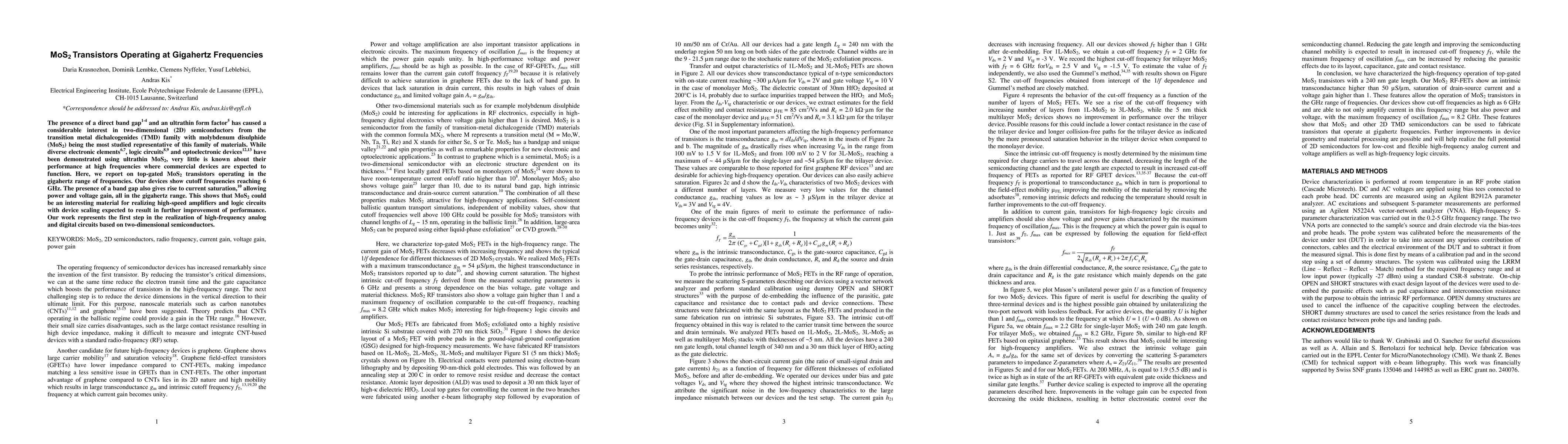 This paper reports on top-gated MoS2 transistors operating at gigahertz frequencies, achieving cutoff frequencies up to 6 GHz, demonstrating potential for high-speed amplifiers and logic circuits. The study highlights the material's suitability for future device scaling in high-frequency analog and digital circuits.