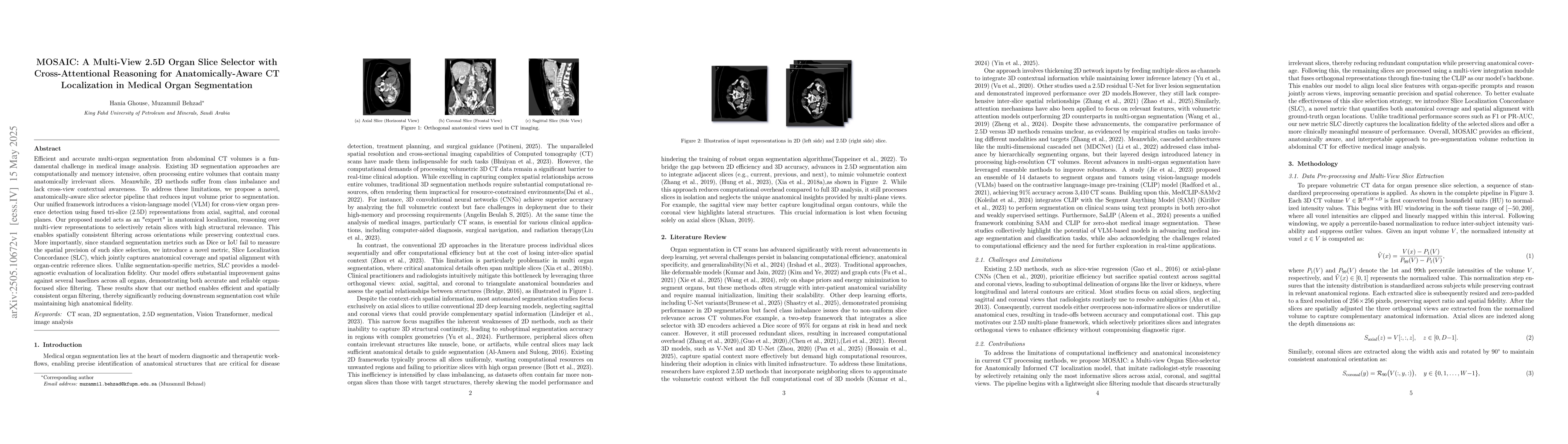 This research is important as it addresses the limitations of existing 3D and 2D segmentation approaches by efficiently and accurately segmenting multiple organs from abdominal CT volumes, reducing computational and memory intensity, and providing a model-agnostic evaluation metric for localization fidelity.