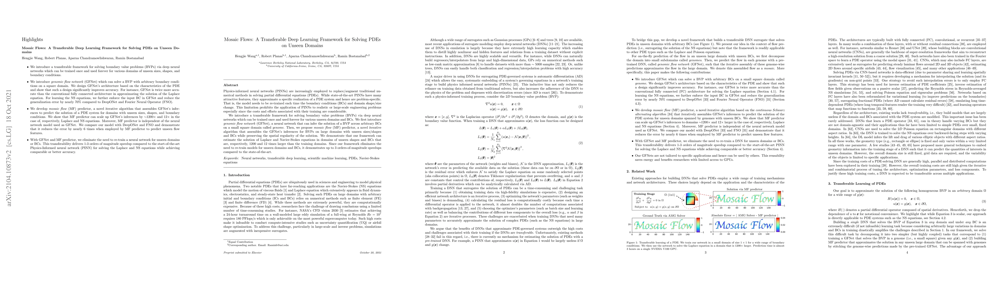 This paper introduces a transferable deep learning framework called Mosaic Flows for solving partial differential equations (PDEs) on unseen domains. The proposed genomic flow network (GFNet) and mosaic flow (MF) predictor enable solving boundary value problems without retraining, achieving up to 3 orders-of-magnitude speedups compared to existing methods.