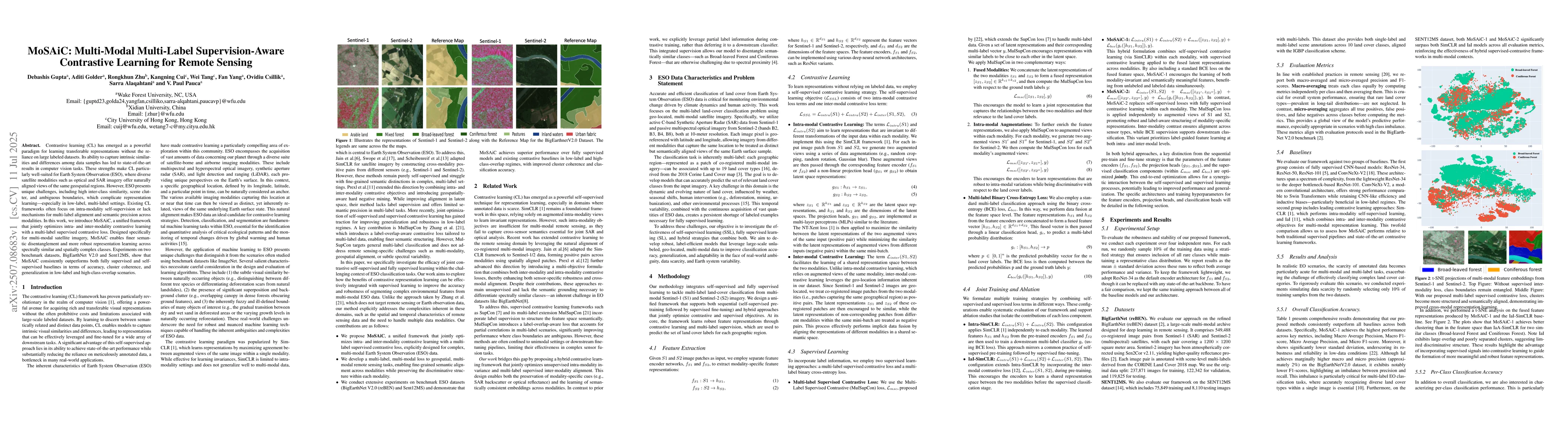Contrastive learning (CL) has emerged as a powerful paradigm for learning transferable representations without the reliance on large labeled datasets. Its ability to capture intrinsic similarities and differences among data samples has led to state-of-the-art results in computer vision tasks. These strengths make CL particularly well-suited for Earth System Observation (ESO), where diverse satellite modalities such as optical and SAR imagery offer naturally aligned views of the same geospatial regions. However, ESO presents unique challenges, including high inter-class similarity, scene clutter, and ambiguous boundaries, which complicate representation learning -- especially in low-label, multi-label settings. Existing CL frameworks often focus on intra-modality self-supervision or lack mechanisms for multi-label alignment and semantic precision across modalities. In this work, we introduce MoSAiC, a unified framework that jointly optimizes intra- and inter-modality contrastive learning with a multi-label supervised contrastive loss. Designed specifically for multi-modal satellite imagery, MoSAiC enables finer semantic disentanglement and more robust representation learning across spectrally similar and spatially complex classes. Experiments on two benchmark datasets, BigEarthNet V2.0 and Sent12MS, show that MoSAiC consistently outperforms both fully supervised and self-supervised baselines in terms of accuracy, cluster coherence, and generalization in low-label and high-class-overlap scenarios.