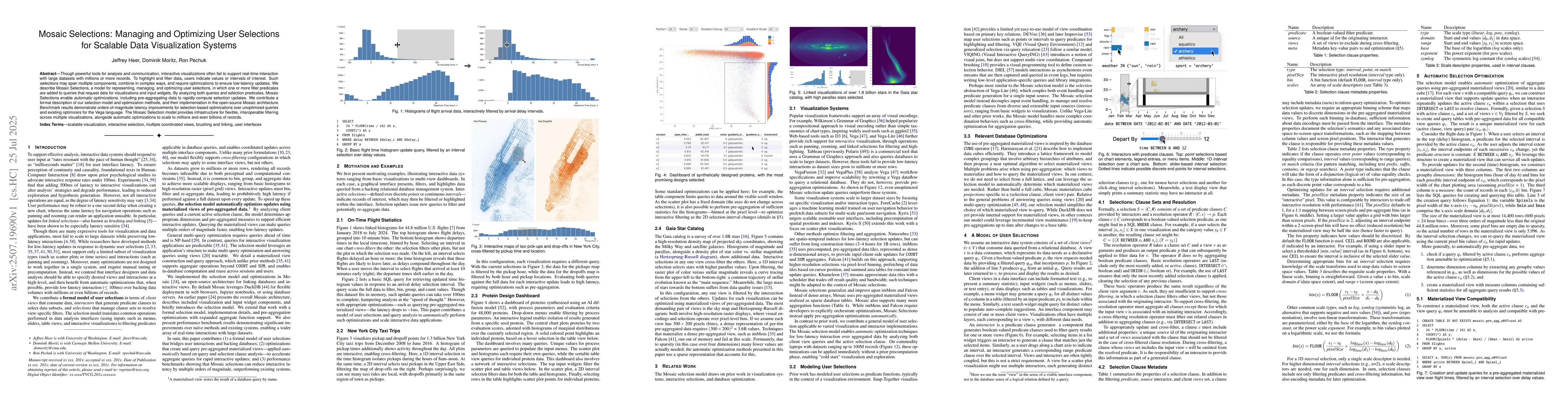 Though powerful tools for analysis and communication, interactive visualizations often fail to support real-time interaction with large datasets with millions or more records. To highlight and filter data, users indicate values or intervals of interest. Such selections may span multiple components, combine in complex ways, and require optimizations to ensure low-latency updates. We describe Mosaic Selections, a model for representing, managing, and optimizing user selections, in which one or more filter predicates are added to queries that request data for visualizations and input widgets. By analyzing both queries and selection predicates, Mosaic Selections enable automatic optimizations, including pre-aggregating data to rapidly compute selection updates. We contribute a formal description of our selection model and optimization methods, and their implementation in the open-source Mosaic architecture. Benchmark results demonstrate orders-of-magnitude latency improvements for selection-based optimizations over unoptimized queries and existing optimizers for the Vega language. The Mosaic Selection model provides infrastructure for flexible, interoperable filtering across multiple visualizations, alongside automatic optimizations to scale to millions and even billions of records.