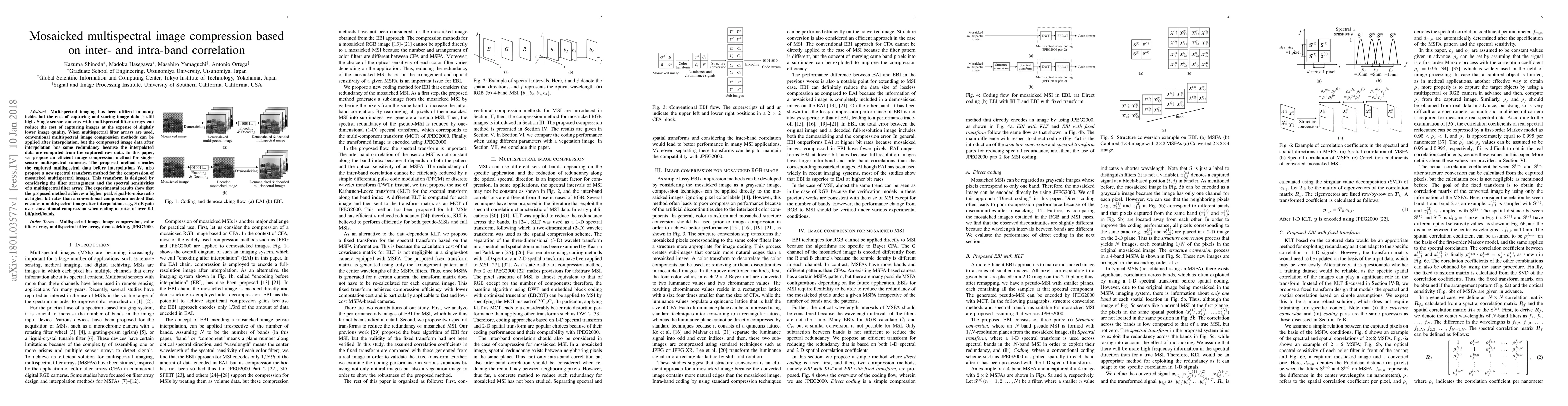 Multispectral imaging has been utilized in many fields, but the cost of capturing and storing image data is still high. Single-sensor cameras with multispectral filter arrays can reduce the cost of capturing images at the expense of slightly lower image quality. When multispectral filter arrays are used, conventional multispectral image compression methods can be applied after interpolation, but the compressed image data after interpolation has some redundancy because the interpolated data are computed from the captured raw data. In this paper, we propose an efficient image compression method for single-sensor multispectral cameras. The proposed method encodes the captured multispectral data before interpolation. We also propose a new spectral transform method for the compression of mosaicked multispectral images. This transform is designed by considering the filter arrangement and the spectral sensitivities of a multispectral filter array. The experimental results show that the proposed method achieves a higher peak signal-to-noise ratio at higher bit rates than a conventional compression method that encodes a multispectral image after interpolation, e.g., 3-dB gain over conventional compression when coding at rates of over 0.1 bit/pixel/bands.