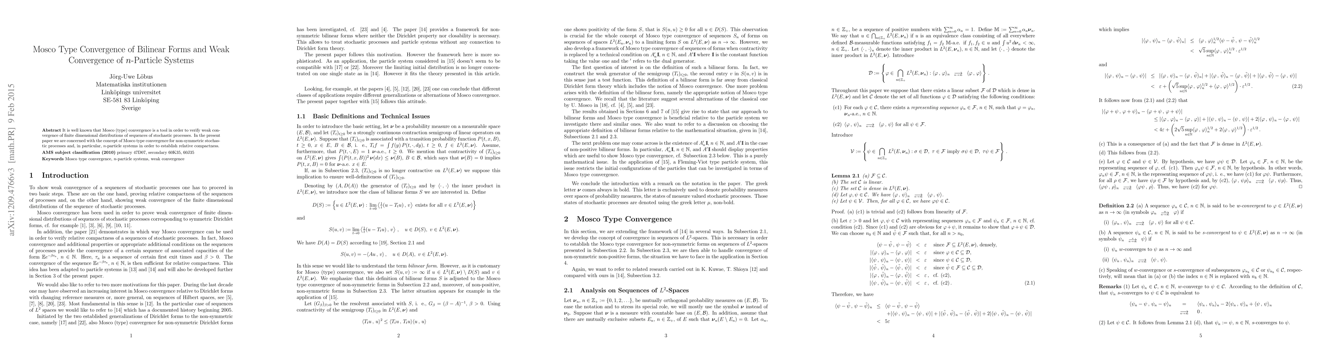 Summary: This paper explores Mosco type convergence for non-symmetric stochastic processes and $n$-particle systems, aiming to establish relative compactness and verify weak convergence of finite-dimensional distributions. The focus is on extending the concept to non-symmetric settings.