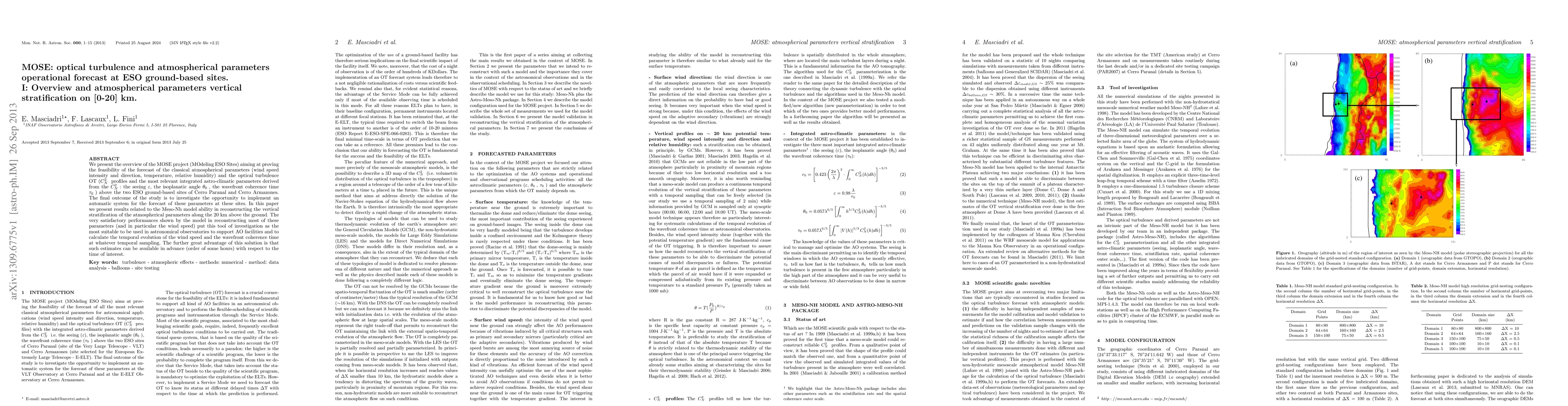 This paper provides an overview of the MOSE project, which aims to forecast atmospheric parameters and optical turbulence at ESO ground-based sites. The Meso-NH model successfully reconstructs the vertical stratification of these parameters up to 20 km, demonstrating its potential to support adaptive optics facilities and provide advanced estimates for wind speed and wavefront coherence time.