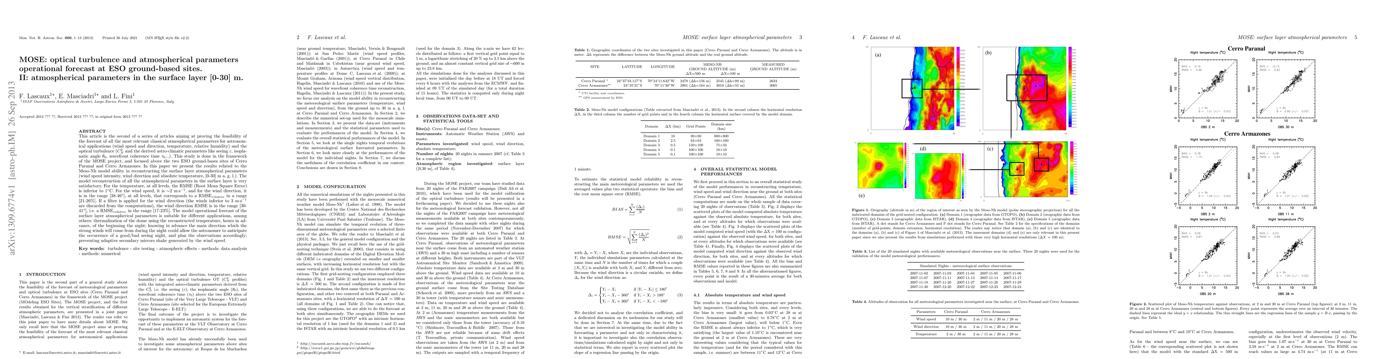 This article is the second of a series of articles aiming at proving the feasibility of the forecast of all the most relevant classical atmospherical parameters for astronomical applications (wind speed and direction, temperature, relative humidity) and the optical turbulence (Cn2 and the derived astro-climatic parameters like seeing, isoplanatic angle, wavefront coherence time...). This study is done in the framework of the MOSE project, and focused above the two ESO ground-bases sites of Cerro Paranal and Cerro Armazones. In this paper we present the results related to the Meso-Nh model ability in reconstructing the surface layer atmospherical parameters (wind speed intensity, wind direction and absolute temperature, [0-30] m a.g.l.). The model reconstruction of all the atmospherical parameters in the surface layer is very satisfactory. For the temperature, at all levels, the RMSE (Root Mean Square Error) is inferior to 1{\deg}C. For the wind speed, it is ~2 m/s, and for the wind direction, it is in the range [38-46{\deg}], at all levels, that corresponds to a RMSE_relative in a range [21-26{\deg}]. If a filter is applied for the wind direction (the winds inferior to 3 m/s are discarded from the computations), the wind direction RMSE is in the range [30-41{\deg}], i.e. a RMSE_relative in the range [17-23{\deg}]. The model operational forecast of the surface layer atmospherical parameters is suitable for different applications, among others: thermalization of the dome using the reconstructed temperature, hours in advance, of the beginning the night; knowing in advance the main direction which the strong winds will come from during the night could allow the astronomer to anticipate the occurrence of a good/bad seeing night, and plan the observations accordingly; preventing adaptive secondary mirrors shake generated by the wind speed.