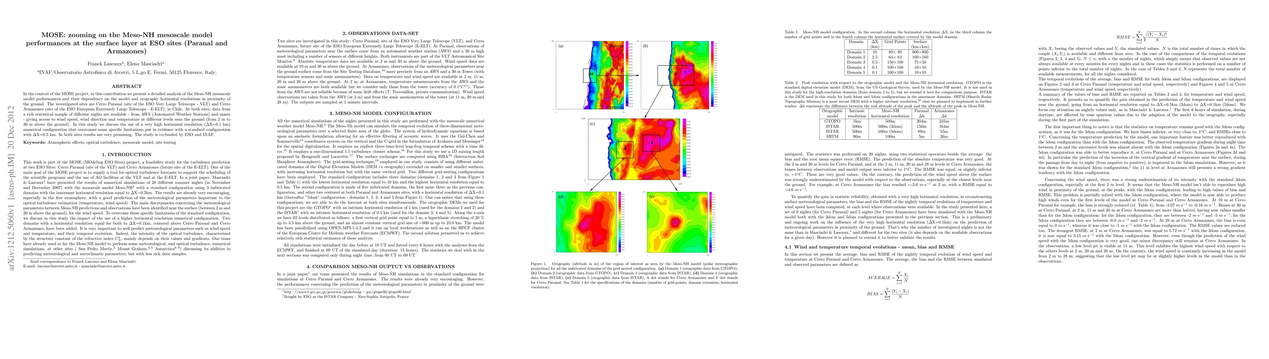 In the context of the MOSE project, in this contribution we present a detailed analysis of the Meso-NH mesoscale model performances and their dependency on the model and orography horizontal resolutions in proximity of the ground. The investigated sites are Cerro Paranal (site of the ESO Very Large Telescope - VLT) and Cerro Armazones (site of the ESO European Extremely Large Telescope - E-ELT), in Chile. At both sites, data from a rich statistical sample of different nights are available - from AWS (Automated Weather Stations) and masts - giving access to wind speed, wind direction and temperature at different levels near the ground (from 2 m to 30 m above the ground). In this study we discuss the use of a very high horizontal resolution (dX=0.1 km) numerical configuration that overcomes some specific limitations put in evidence with a standard configuration with dX=0.5 km. In both sites results are very promising. The study is co-funded by ESO and INAF.