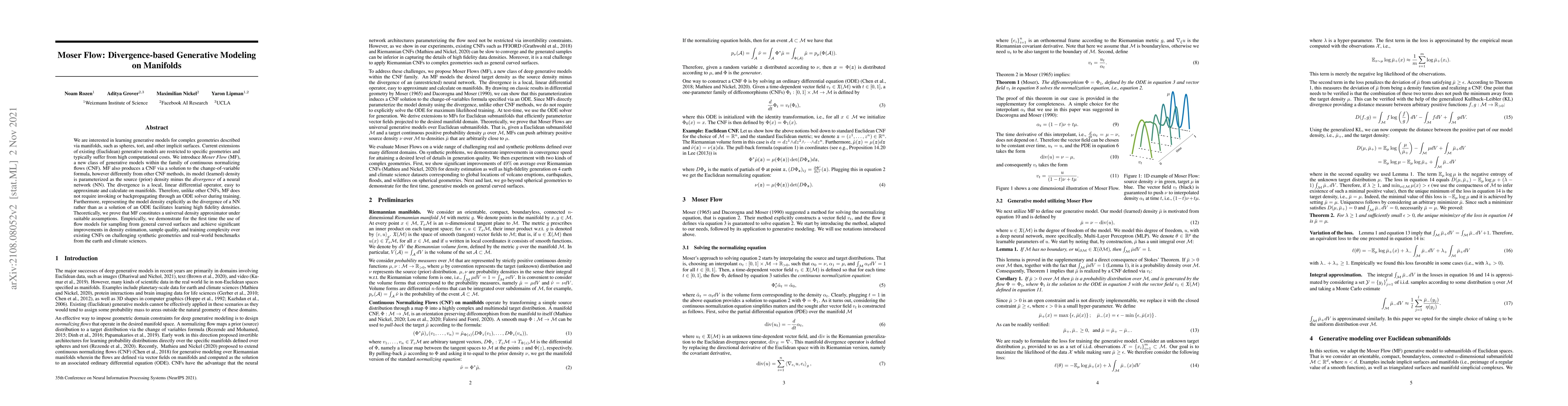 We are interested in learning generative models for complex geometries described via manifolds, such as spheres, tori, and other implicit surfaces. Current extensions of existing (Euclidean) generative models are restricted to specific geometries and typically suffer from high computational costs. We introduce Moser Flow (MF), a new class of generative models within the family of continuous normalizing flows (CNF). MF also produces a CNF via a solution to the change-of-variable formula, however differently from other CNF methods, its model (learned) density is parameterized as the source (prior) density minus the divergence of a neural network (NN). The divergence is a local, linear differential operator, easy to approximate and calculate on manifolds. Therefore, unlike other CNFs, MF does not require invoking or backpropagating through an ODE solver during training. Furthermore, representing the model density explicitly as the divergence of a NN rather than as a solution of an ODE facilitates learning high fidelity densities. Theoretically, we prove that MF constitutes a universal density approximator under suitable assumptions. Empirically, we demonstrate for the first time the use of flow models for sampling from general curved surfaces and achieve significant improvements in density estimation, sample quality, and training complexity over existing CNFs on challenging synthetic geometries and real-world benchmarks from the earth and climate sciences.