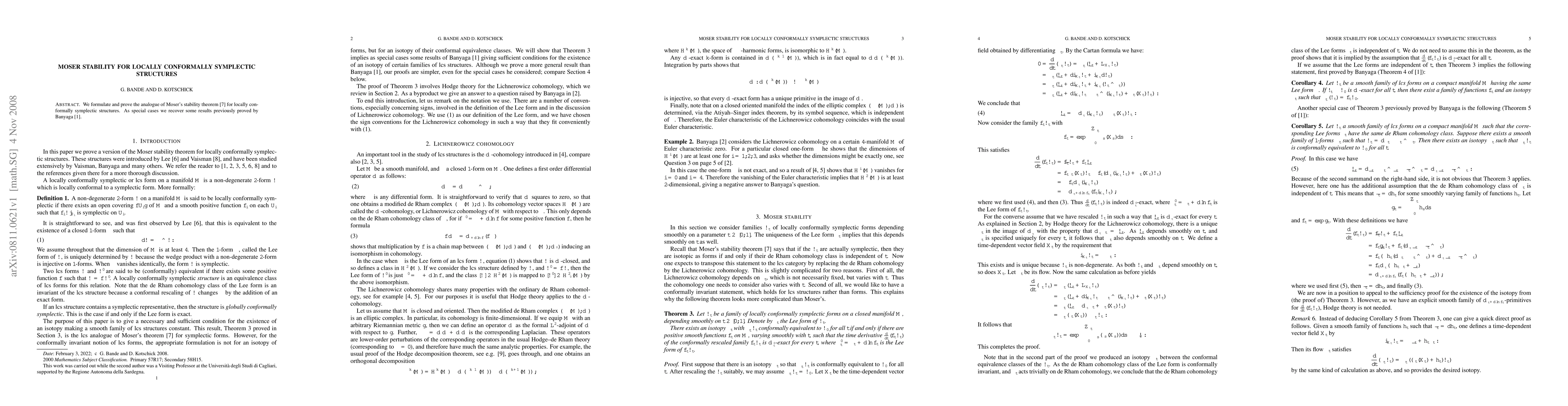 Summary: The paper formulates and proves Moser stability for locally conformally symplectic structures, extending previous results and establishing a parallel to Moser's stability theorem in this context. Special cases include previously proven results by Banyaga.