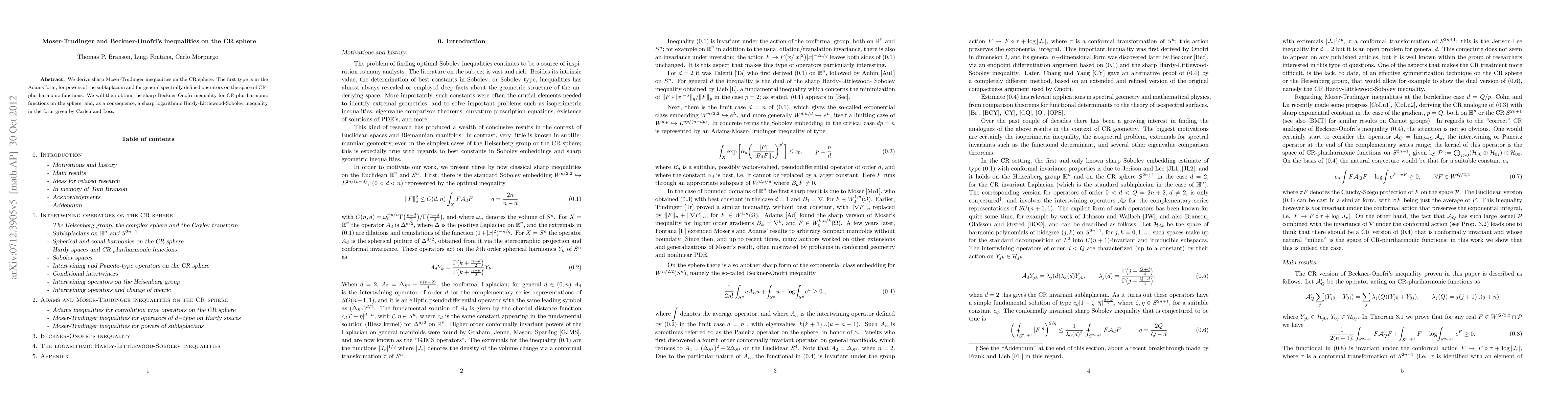 We derive sharp Moser-Trudinger inequalities on the CR sphere. The first type is in the Adams form, for powers of the sublaplacian and for general spectrally defined operators on the space of CR-pluriharmonic functions. We will then obtain the sharp Beckner-Onofri inequality for CR-pluriharmonic functions on the sphere, and, as a consequence, a sharp logarithmic Hardy-Littlewood-Sobolev inequality in the form given by Carlen and Loss.