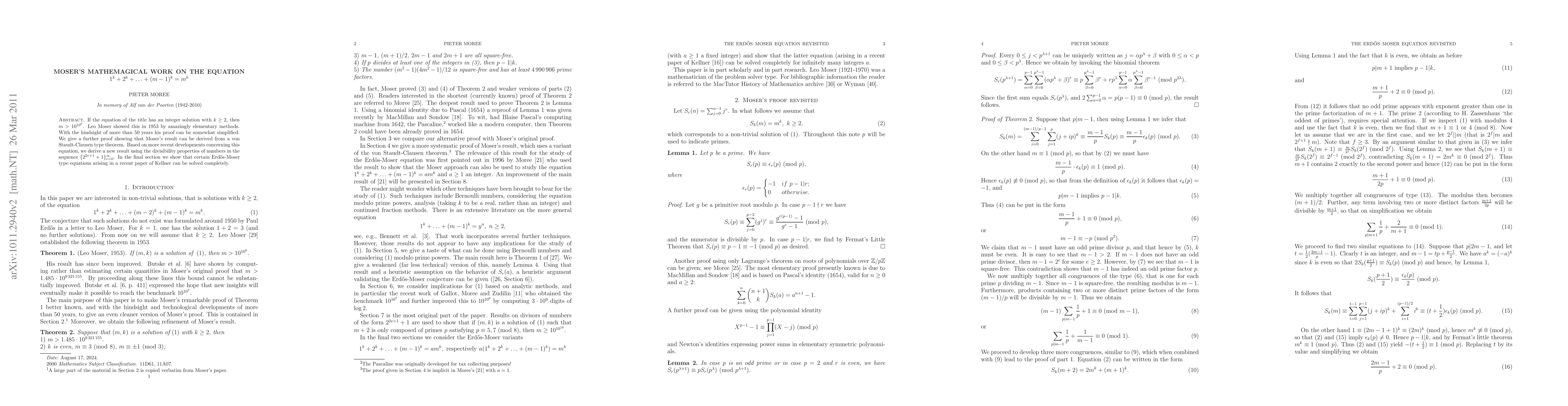 Researchers prove a 1953 theorem by Leo Moser, showing that if the equation 1^k+2^k+...+(m-1)^k=m^k has an integer solution with k>=2, then m must be greater than 10^{10^6}. The new proof uses recent developments in number theory to derive a related result.