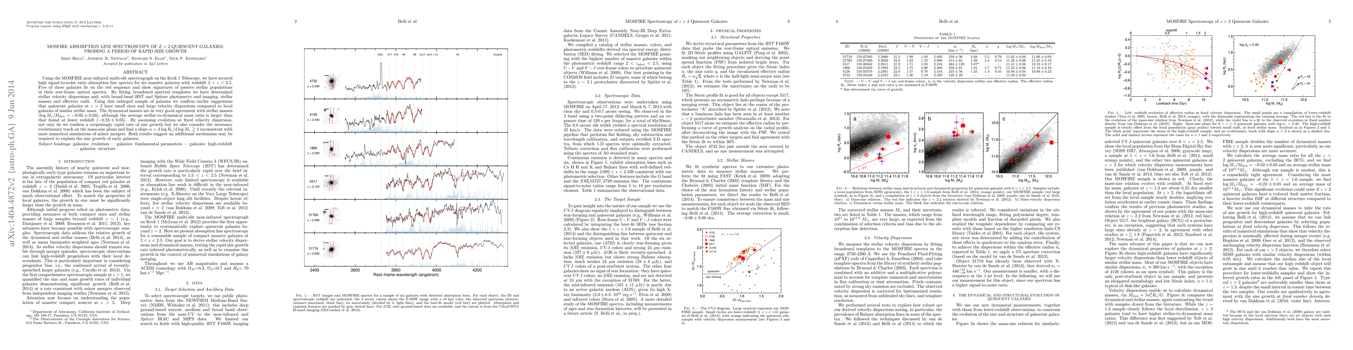 Using the MOSFIRE near-infrared multi-slit spectrograph on the Keck 1 Telescope, we have secured high signal-to-noise ratio absorption line spectra for six massive galaxies with redshift 2 < z < 2.5. Five of these galaxies lie on the red sequence and show signatures of passive stellar populations in their rest-frame optical spectra. By fitting broadened spectral templates we have determined stellar velocity dispersions and, with broad-band HST and Spitzer photometry and imaging, stellar masses and effective radii. Using this enlarged sample of galaxies we confirm earlier suggestions that quiescent galaxies at z > 2 have small sizes and large velocity dispersions compared to local galaxies of similar stellar mass. The dynamical masses are in very good agreement with stellar masses (log Mstar/Mdyn = -0.02 +/- 0.03), although the average stellar-to-dynamical mass ratio is larger than that found at lower redshift (-0.23 +/- 0.05). By assuming evolution at fixed velocity dispersion, not only do we confirm a surprisingly rapid rate of size growth but we also consider the necessary evolutionary track on the mass-size plane and find a slope alpha = dlogR / dlogM > ~2 inconsistent with most numerical simulations of minor mergers. Both results suggest an additional mechanism may be required to explain the size growth of early galaxies.