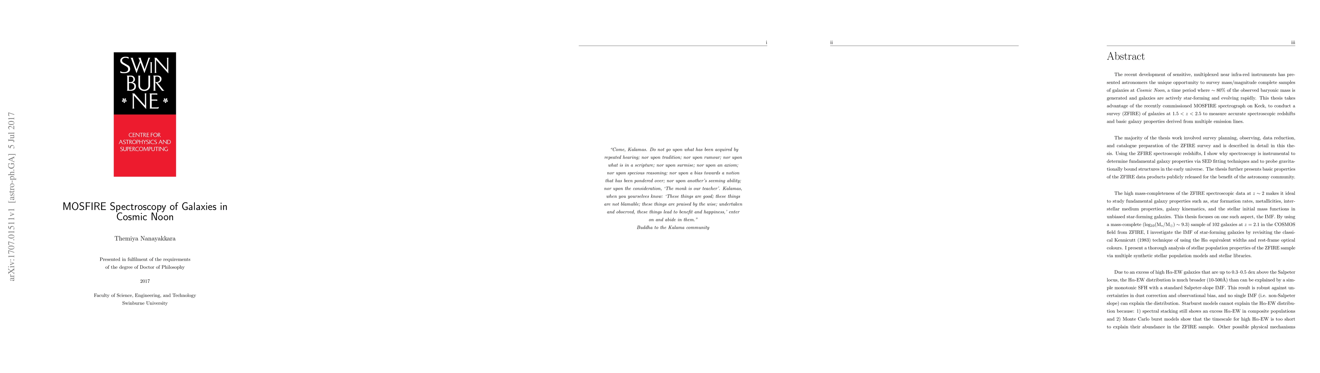This paper utilizes MOSFIRE spectroscopy to survey galaxies during Cosmic Noon ($1.5<z<2.5$), focusing on star-forming galaxies to study their star formation rates, metallicities, and stellar initial mass functions. The ZFIRE survey provides high-quality redshifts and galaxy properties, highlighting the importance of spectroscopy in understanding early universe structures and galaxy evolution.
