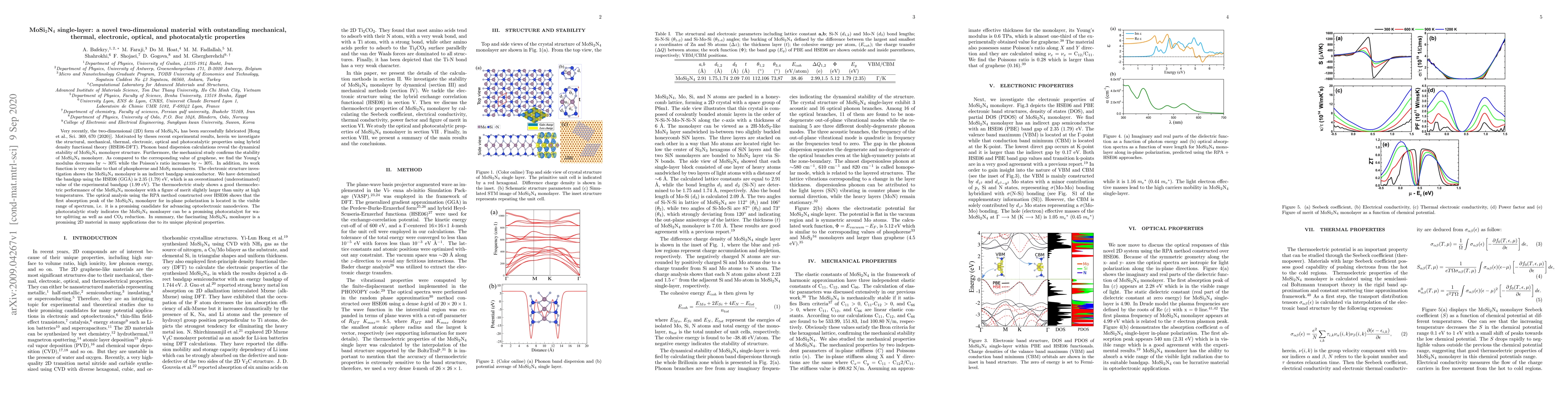 MoSi2N4 monolayer, a newly fabricated two-dimensional material, exhibits remarkable mechanical, thermal, electronic, optical, and photocatalytic properties, making it a promising candidate for various advanced applications. Theoretical studies reveal its stability, semiconductor behavior, and potential for optoelectronics and photocatalysis.