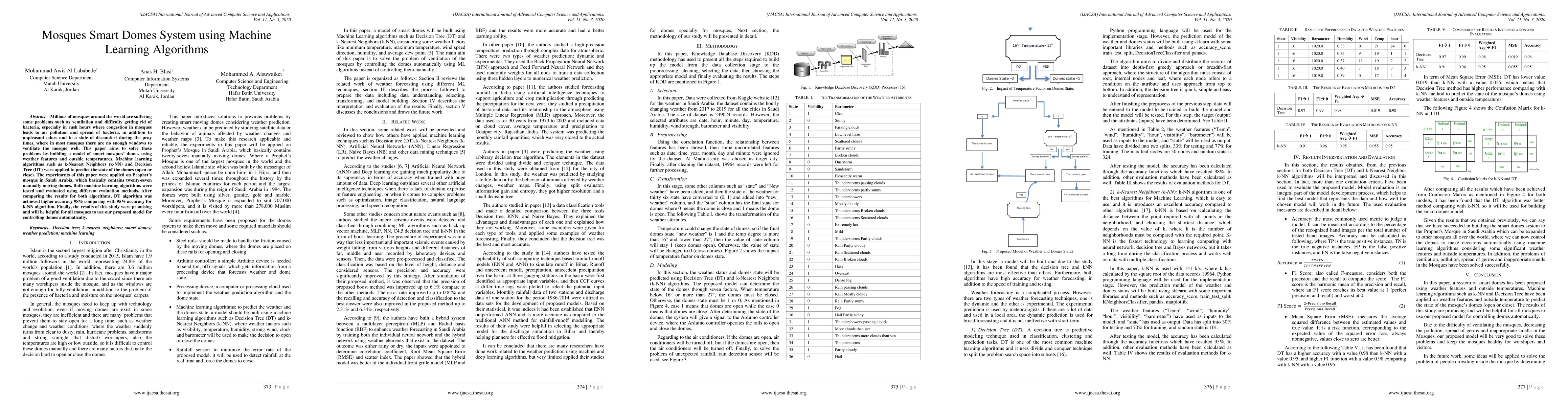 A smart dome system for mosques uses machine learning algorithms to predict dome opening based on weather features and outside temperatures, achieving 98% accuracy.
