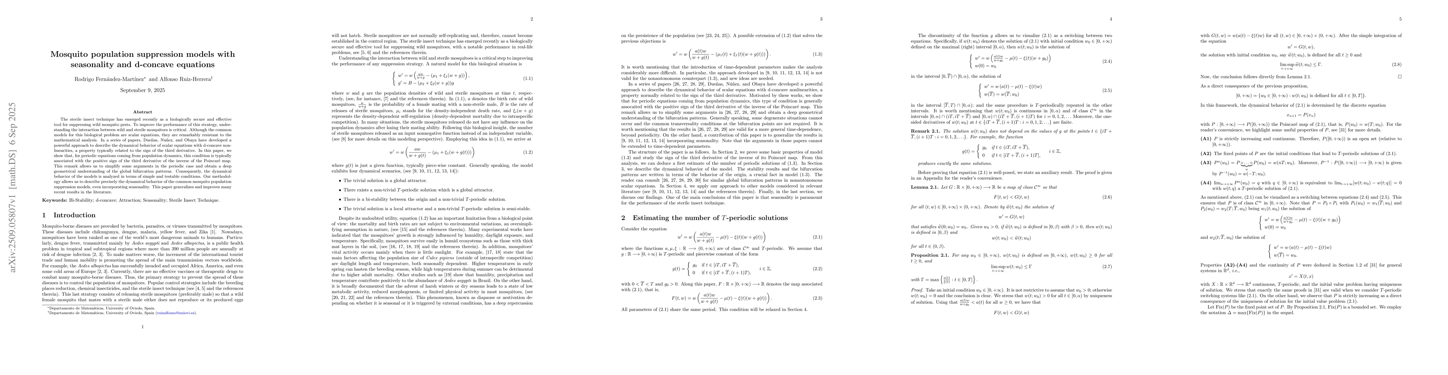 The sterile insect technique has emerged recently as a biologically secure and effective tool for suppressing wild mosquito pests. To improve the performance of this strategy, understanding the interaction between wild and sterile mosquitoes is critical. Although the common models for this biological problem are scalar equations, they are remarkably resistant to the mathematical analysis. In a series of papers, Due\~nas, Nu\~nez, and Obaya have developed a powerful approach to describe the dynamical behavior of scalar equations with d-concave nonlinearities, a property typically related to the sign of the third derivative. In this paper, we show that, for periodic equations coming from population dynamics, this condition is typically associated with the positive sign of the third derivative of the inverse of the Poincar\'e map. This remark allows us to simplify some arguments in the periodic case and obtain a deep geometrical understanding of the global bifurcation patterns. Consequently, the dynamical behavior of the models is analyzed in terms of simple and testable conditions. Our methodology allows us to describe precisely the dynamical behavior of the common mosquito population suppression models, even incorporating seasonality. This paper generalizes and improves many recent results in the literature.