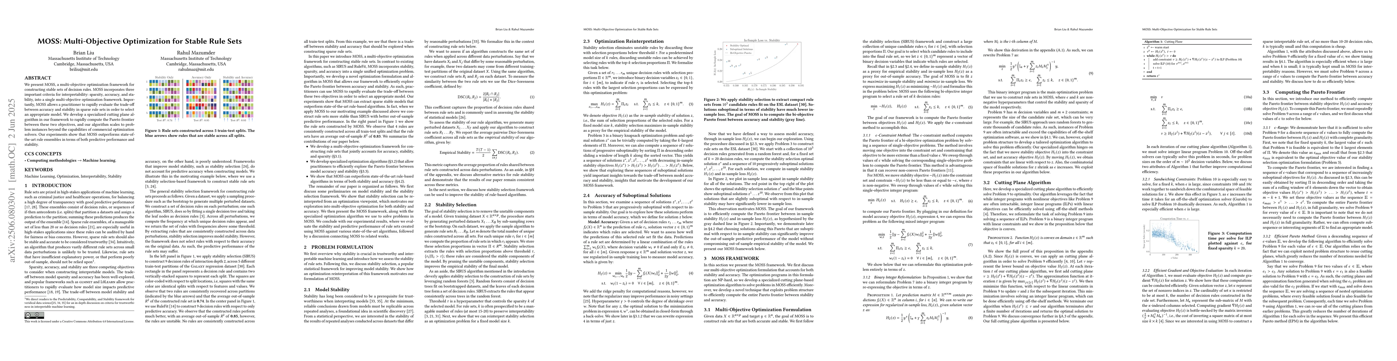 The MOSS framework optimizes stable rule sets for decision-making, balancing accuracy, sparsity, and stability in a single multi-objective optimization framework. It outperforms state-of-the-art rule ensembles with improved predictive performance and stability.