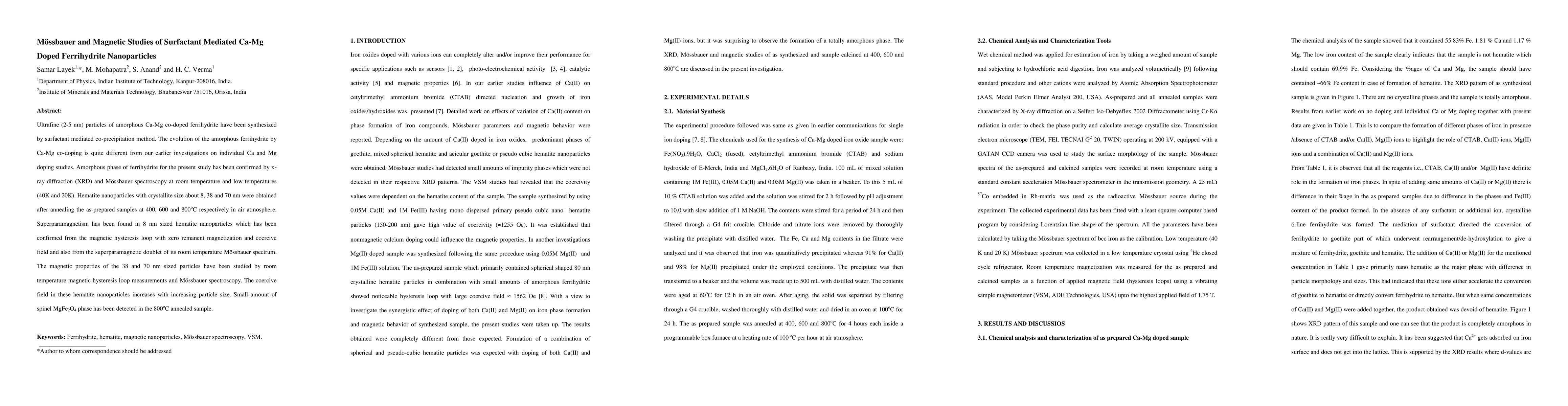 This study synthesizes ultrafine Ca-Mg co-doped ferrihydrite nanoparticles via surfactant-mediated co-precipitation, revealing distinct evolution compared to individual doping. Annealing these nanoparticles produces hematite with sizes ranging from 8 to 70 nm, exhibiting superparamagnetism in the smallest particles confirmed by magnetic hysteresis and Mössbauer spectroscopy. Larger particles show increased coercive fields with size.