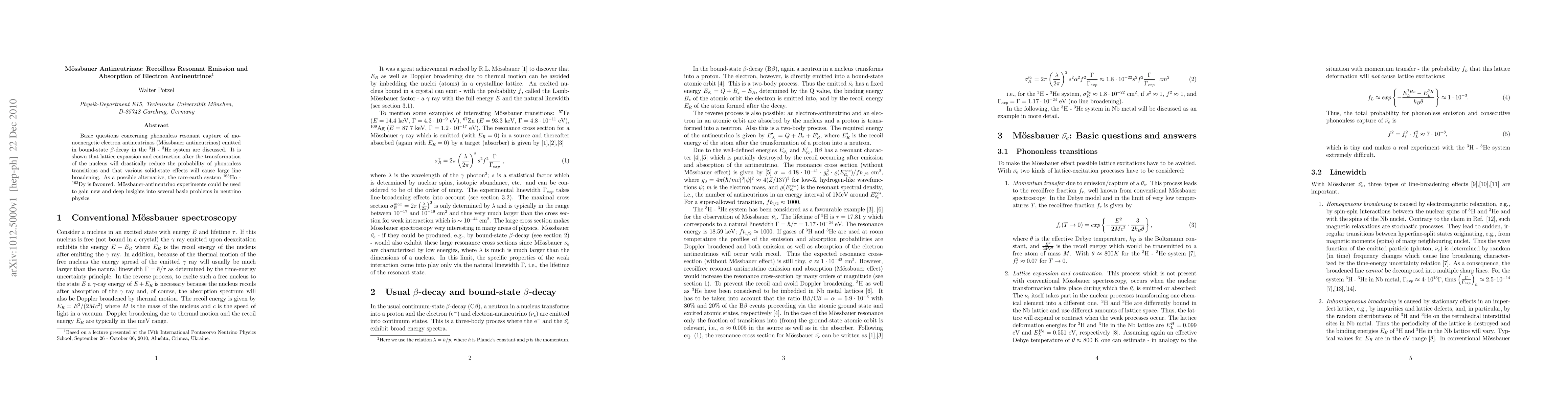 Basic questions concerning phononless resonant capture of monoenergetic electron antineutrinos (M\"ossbauer antineutrinos) emitted in bound-state beta-decay in the 3H - 3He system are discussed. It is shown that lattice expansion and contraction after the transformation of the nucleus will drastically reduce the probability of phononless transitions and that various solid-state effects will cause large line broadening. As a possible alternative, the rare-earth system 163Ho - 163Dy is favoured. M\"ossbauer-antineutrino experiments could be used to gain new and deep insights into several basic problems in neutrino physics.