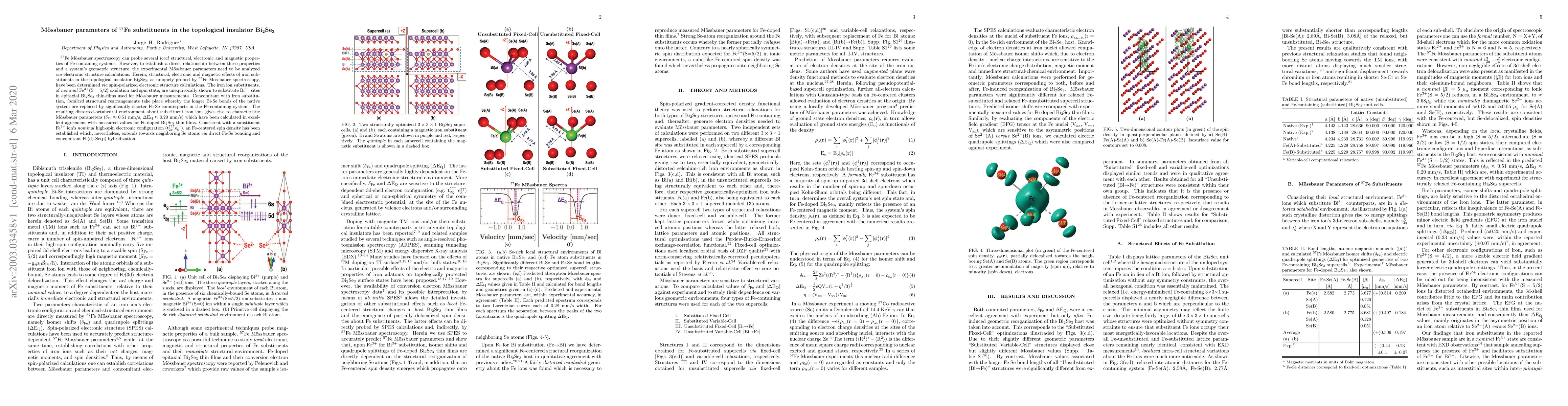 $^{57}$Fe M\"ossbauer spectroscopy can probe several \emph{local} structural, electronic and magnetic properties of Fe-containing systems. However, to establish a direct relationship between these properties and a system's geometric structure, the experimental M\"ossbauer parameters need to be analyzed \emph{via} electronic structure calculations. Herein, structural, electronic and magnetic effects of iron substituents in the topological insulator $Bi_2Se_3$, as uniquely probed by $^{57}$Fe M\"ossbauer spectroscopy, have been determined \emph{via} spin-polarized electronic structure calculations. The iron ion substituents, of \emph{nominal} Fe$^{3+}(S = 5/2)$ oxidation and spin state, are unequivocally shown to substitute Bi$^{3+}$ sites in epitaxial $Bi_2Se_3$ thin-films used for M\"ossbauer measurements. Concomitant with iron substitution, \emph{localized} structural rearrangements take place whereby the longer Bi-Se bonds of the native system are replaced by significantly shorter Fe-Se counterparts in the Fe-containing system. The resulting distorted-octahedral environment about substituent iron ions gives rise to characteristic M\"ossbauer parameters ($\delta_{Fe} \approx$ 0.51 mm/s, $\Delta E_{Q} \approx$ 0.20 mm/s) which have been calculated in excellent agreement with measured values for Fe-doped $Bi_2Se_3$ thin films. Consistent with a substituent Fe$^{3+}$ ion's \emph{nominal} high-spin electronic configuration ($t_{2g}^{\uparrow \uparrow \uparrow} e_g^{\uparrow \uparrow}$), an Fe-centered spin density has been established which, nevertheless, extends towards neighboring Se atoms \emph{via} direct Fe-Se bonding and concomitant Fe(d)-Se(p) hybridization.