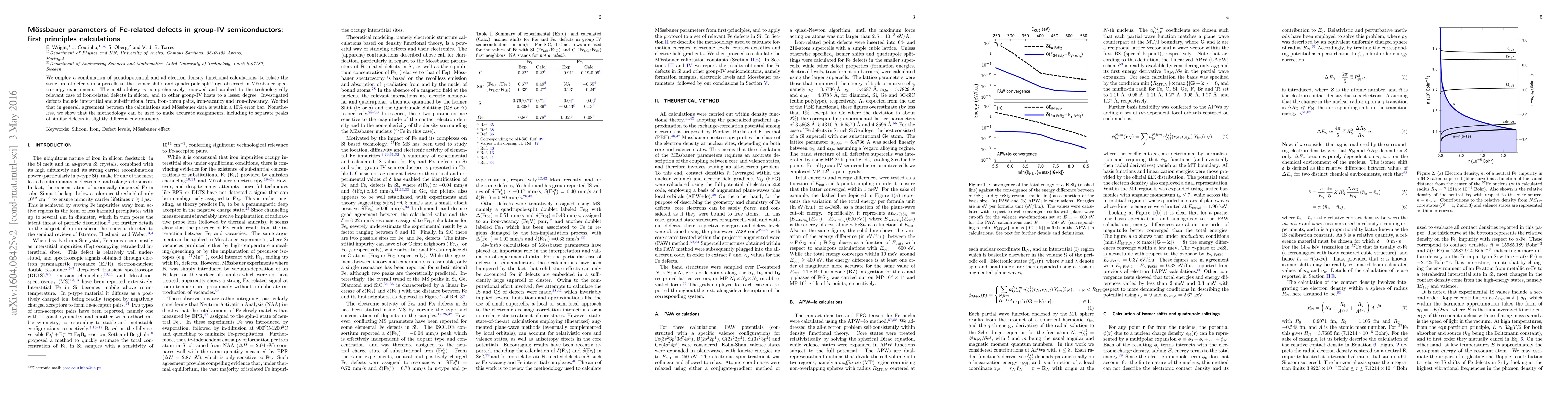 This paper uses pseudopotential and all-electron density functional calculations to determine the Mössbauer parameters of iron-related defects in group-IV semiconductors, achieving a 10% accuracy in comparing calculated isomer shifts and quadrupole splittings with experimental data. The methodology is applied to silicon and other group-IV materials, identifying various iron defects.