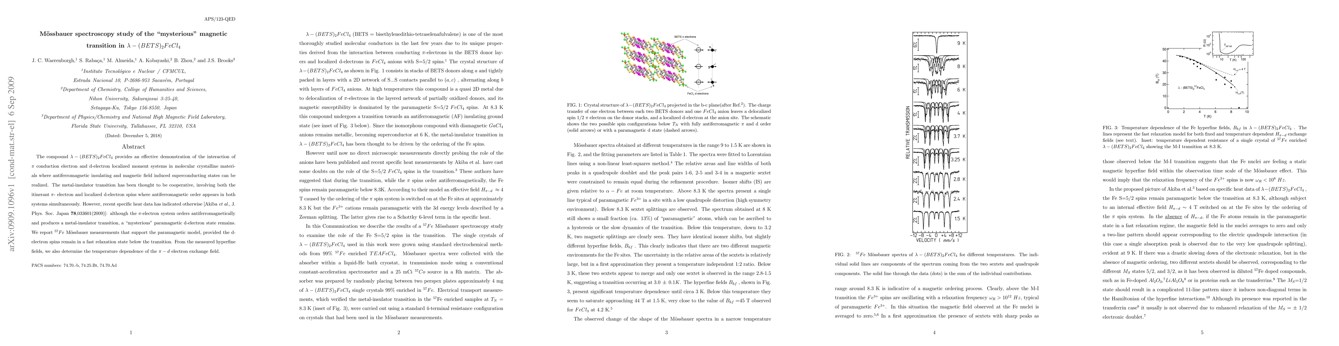 The compound lambda-(BETS)2FeCl4 provides an effective demonstration of the interaction of pi-conduction electron and d-electron localized moment systems in molecular crystalline materials where antiferromagnetic insulating and magnetic field induced superconducting states can be realized. The metal-insulator transition has been thought to be cooperative, involving both the itinerant pi- electron and localized d-electron spins where antiferromagnetic order appears in both systems simultaneously. However, recent specific heat data has indicated otherwise [Akiba et al., J. Phys. Soc. Japan 78,033601(2009)]: although the pi-electron system orders antiferromagnetically and produces a metal-insulator transition, a "mysterious" paramagnetic d-electron state remains. We report 57Fe Mossbauer measurements that support the paramagnetic model, provided the d-electron spins remain in a fast relaxation state below the transition. From the measured hyperfine fields, we also determine the temperature dependence of the pi-d electron exchange field.