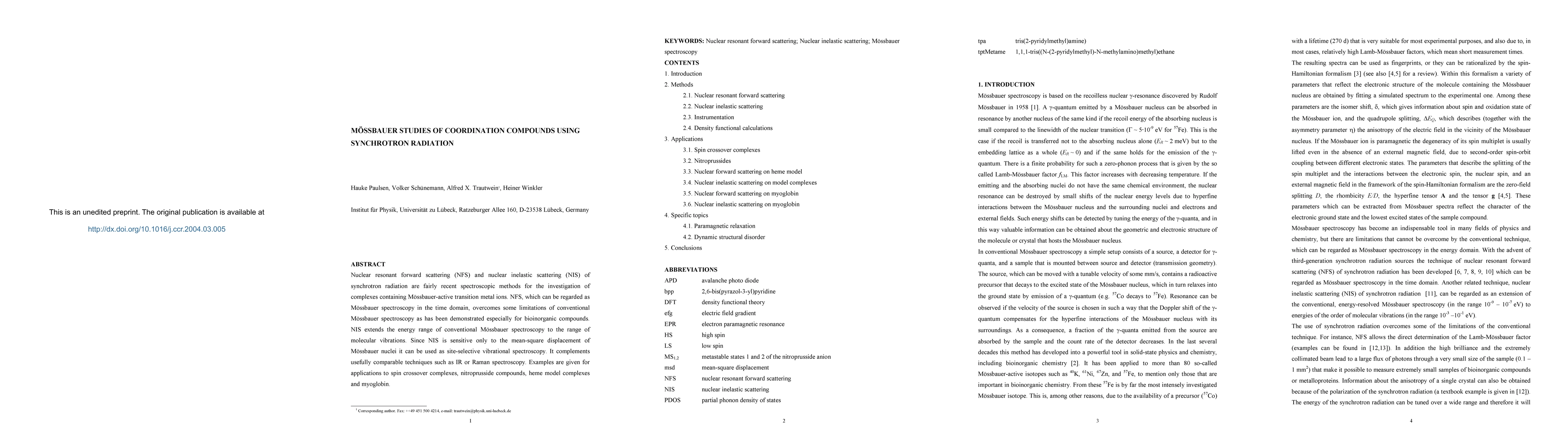 This paper explores the use of synchrotron radiation-based nuclear resonant forward scattering (NFS) and nuclear inelastic scattering (NIS) for studying coordination compounds with Mössbauer-active transition metals. NFS enhances the investigation of bioinorganic compounds, while NIS provides site-selective vibrational spectroscopy, complementing techniques like IR or Raman spectroscopy, demonstrated through applications in spin crossover complexes, nitroprusside compounds, heme model complexes, and myoglobin.