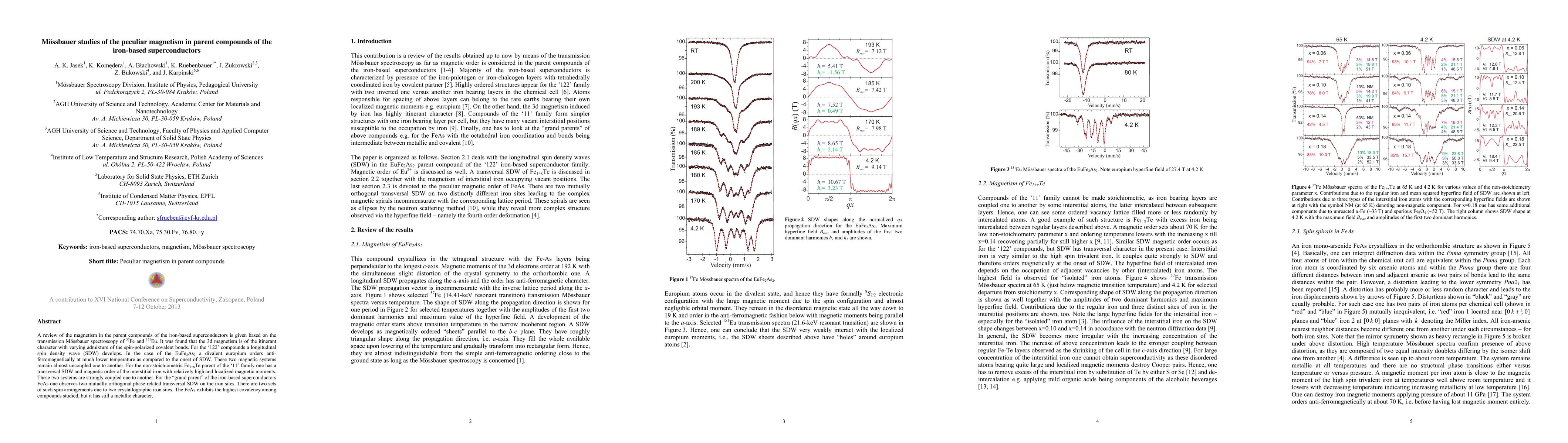 A review of the magnetism in the parent compounds of the iron-based superconductors is given based on the transmission Moessbauer spectroscopy of 57Fe and 151Eu. It was found that the 3d magnetism is of the itinerant character with varying admixture of the spin-polarized covalent bonds. For the 122 compounds a longitudinal spin density wave (SDW) develops. In the case of the EuFe2As2 a divalent europium orders antiferromagnetically at much lower temperature as compared to the onset of SDW. These two magnetic systems remain almost uncoupled one to another. For the non-stoichiometric Fe(1+x)Te parent of the 11 family one has a transversal SDW and magnetic order of the interstitial iron with relatively high and localized magnetic moments. These two systems are strongly coupled one to another. For the grand parent of the iron-based superconductors FeAs one observes two mutually orthogonal phase-related transversal SDW on the iron sites. There are two sets of such spin arrangements due to two crystallographic iron sites. The FeAs exhibits the highest covalency among compounds studied, but it has still a metallic character.