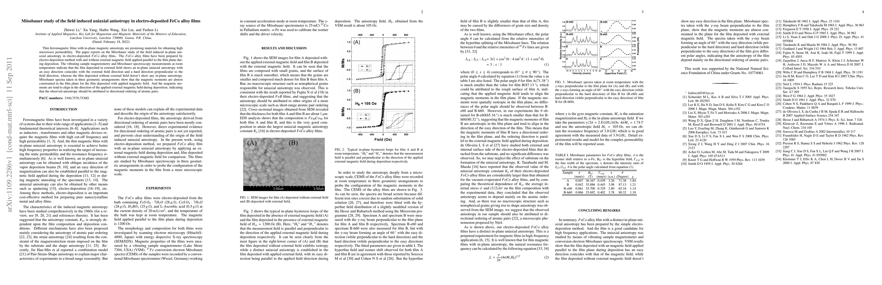 This paper reports on a Mössbauer study of electro-deposited FeCo alloy films, revealing that films deposited with an external magnetic field exhibit in-plane uniaxial anisotropy aligned with the field direction, while those without show no such anisotropy. The study indicates that magnetic moments align in the direction of the applied field, attributing the observed anisotropy to directional atomic pair ordering.