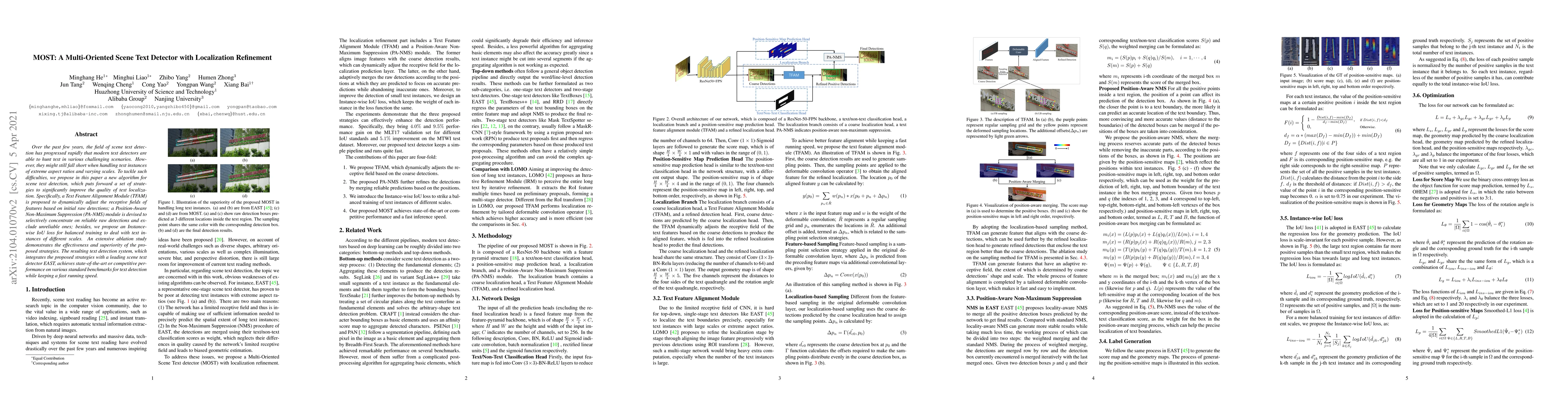 This paper proposes a new algorithm for scene text detection that improves text localization through dynamic feature alignment, position-aware non-maximum suppression, and instance-wise IoU loss, achieving state-of-the-art performance on various benchmarks.