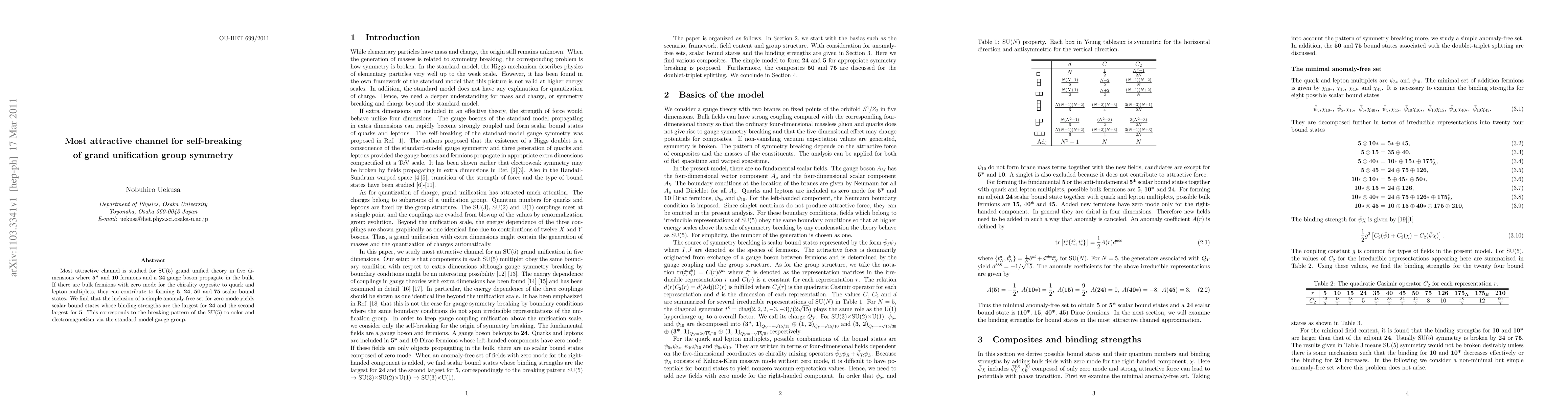 Most attractive channel is studied for SU(5) grand unified theory in five dimensions where 5* and 10 fermions and a 24 gauge boson propagate in the bulk. If there are bulk fermions with zero mode for the chirality opposite to quark and lepton multiplets, they can contribute to forming 5, 24, 50 and 75 scalar bound states. We find that the inclusion of a simple anomaly-free set for zero mode yields scalar bound states whose binding strengths are the largest for 24 and the second largest for 5. This corresponds to the breaking pattern of the SU(5) to color and electromagnetism via the standard model gauge group.