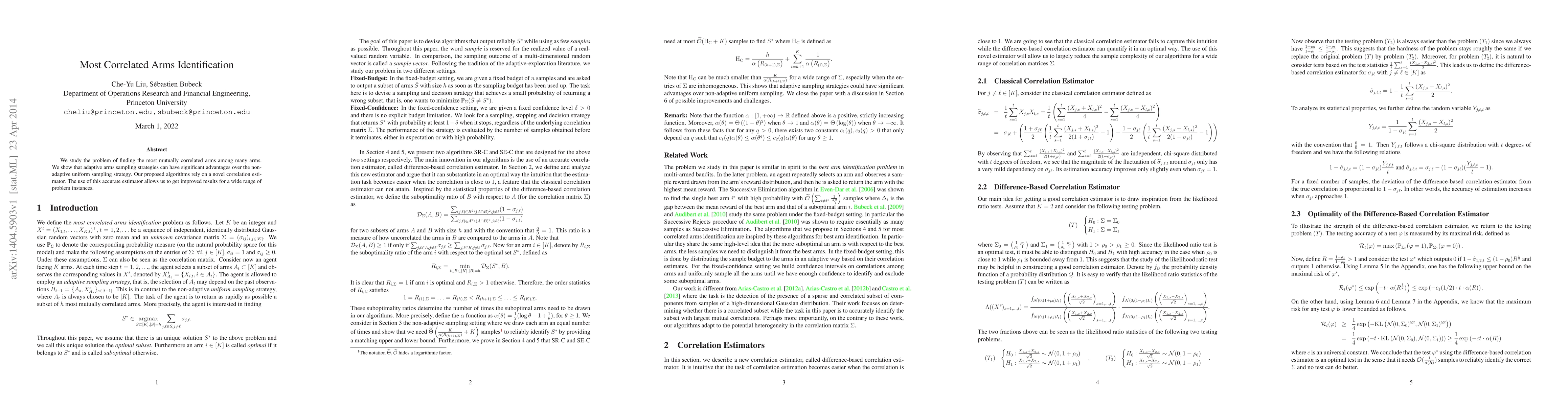 We study the problem of finding the most mutually correlated arms among many arms. We show that adaptive arms sampling strategies can have significant advantages over the non-adaptive uniform sampling strategy. Our proposed algorithms rely on a novel correlation estimator. The use of this accurate estimator allows us to get improved results for a wide range of problem instances.