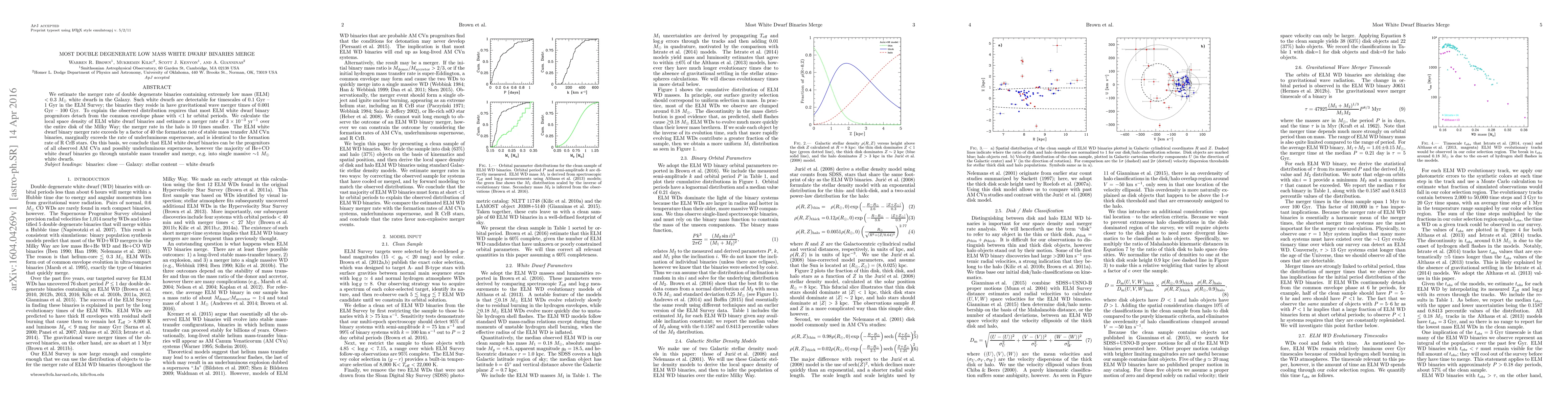 We estimate the merger rate of double degenerate binaries containing extremely low mass (ELM) <0.3 Msun white dwarfs in the Galaxy. Such white dwarfs are detectable for timescales of 0.1 Gyr -- 1 Gyr in the ELM Survey; the binaries they reside in have gravitational wave merger times of 0.001 Gyr -- 100 Gyr. To explain the observed distribution requires that most ELM white dwarf binary progenitors detach from the common envelope phase with <1 hr orbital periods. We calculate the local space density of ELM white dwarf binaries and estimate a merger rate of 3e-3/yr over the entire disk of the Milky Way; the merger rate in the halo is 10 times smaller. The ELM white dwarf binary merger rate exceeds by a factor of 40 the formation rate of stable mass transfer AM CVn binaries, marginally exceeds the rate of underluminous supernovae, and is identical to the formation rate of R CrB stars. On this basis, we conclude that ELM white dwarf binaries can be the progenitors of all observed AM CVn and possibly underluminous supernovae, however the majority of He+CO white dwarf binaries go through unstable mass transfer and merge, e.g. into single massive ~1 Msun white dwarfs.