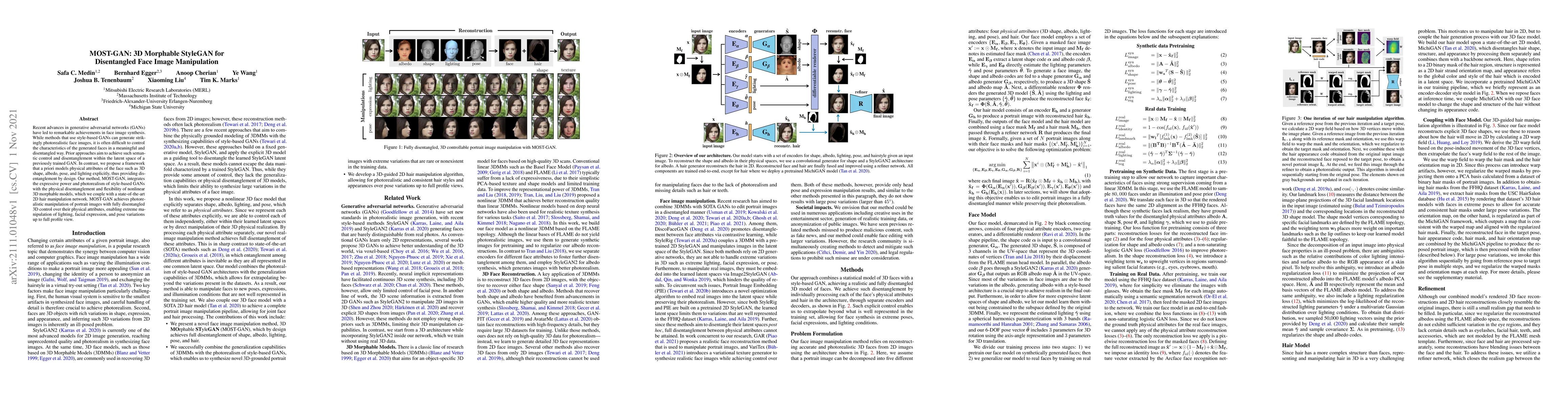 MOST-GAN combines style-based GANs with 3D morphable models to disentangle and manipulate face images by controlling physical attributes like 3D shape, albedo, pose, and lighting, achieving photorealistic and flexible portrait manipulations.