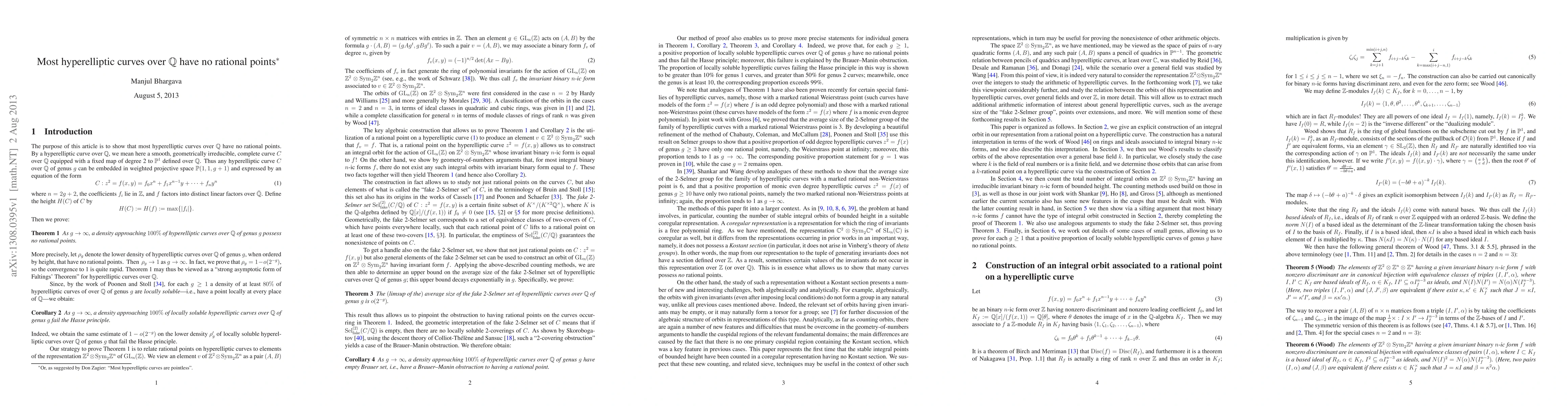 This research demonstrates that most hyperelliptic curves over the rationals have no rational points. It establishes that as the genus increases, the density of curves without rational points approaches 100%, while those that do have local solutions often fail the Hasse principle.