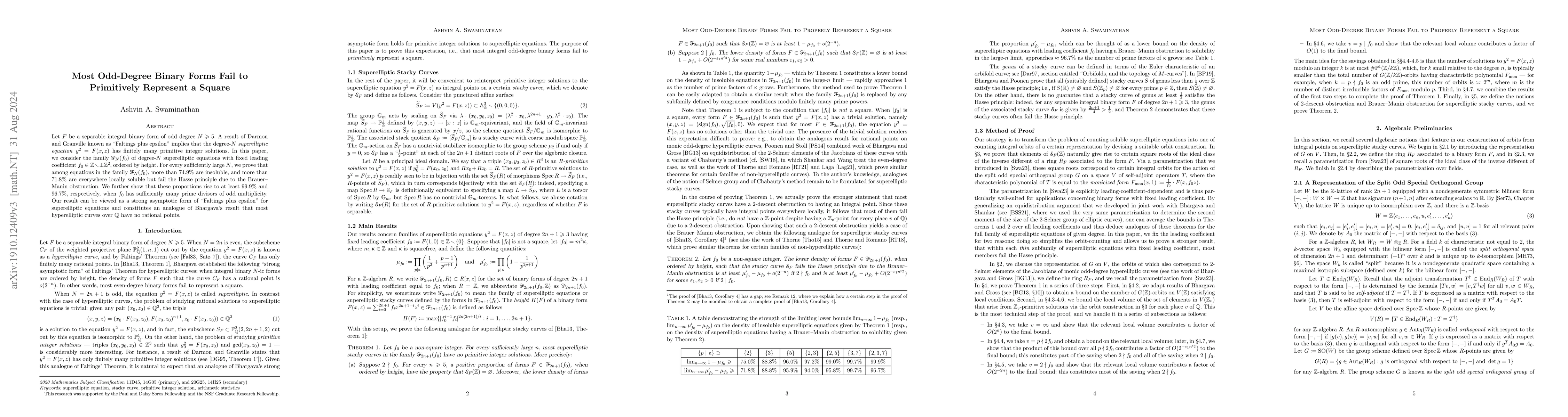 Let $F \in \mathbb{Z}[x,z]$ be a binary form of degree $2n+1 \geq 5$. A result of Darmon and Granville known as "Faltings plus epsilon" states that when $F$ is separable, the superelliptic equation $y^2 = F(x,z)$ has finitely many primitive integer solutions. In this paper, we prove a strong asymptotic version of "Faltings plus epsilon" which states that in families of superelliptic equations of sufficiently large degree and having a fixed non-square leading coefficient, a positive proportion of members have no primitive integer solutions (put another way, a positive proportion of the corresponding binary forms fail to properly represent a square). Moreover, we show that in these families, a positive proportion of everywhere locally soluble members have a Brauer-Manin obstruction to satisfying the Hasse principle. Our result can be viewed as an analogue for superelliptic equations of Bhargava's result that most even-degree hyperelliptic curves over $\mathbb{Q}$ have no rational points.