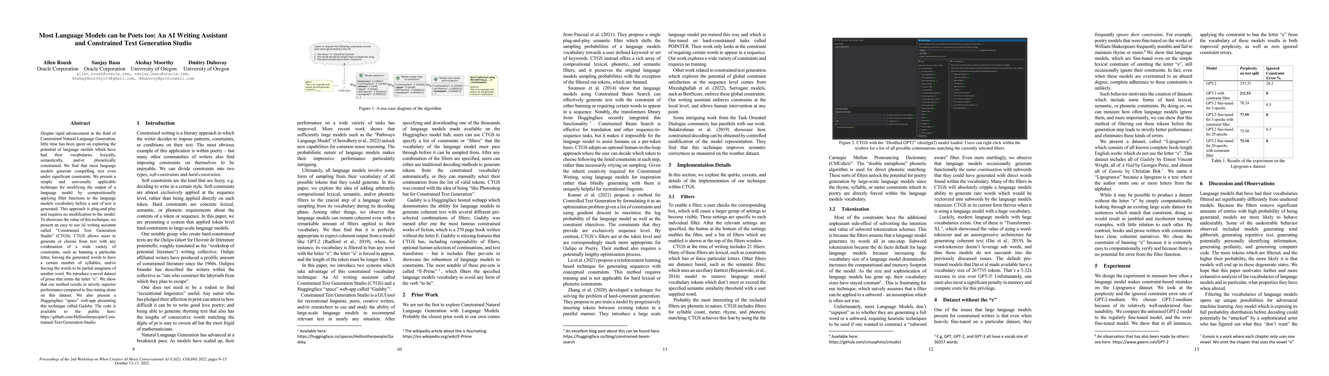 This paper explores the potential of language models under various lexical, semantic, and phonetic constraints, demonstrating that most models can generate compelling text even with significant restrictions. The authors introduce a technique for modifying model outputs by applying filter functions to the vocabulary, requiring no model changes, and present an AI writing assistant called Constrained Text Generation Studio (CTGS) to showcase this method.