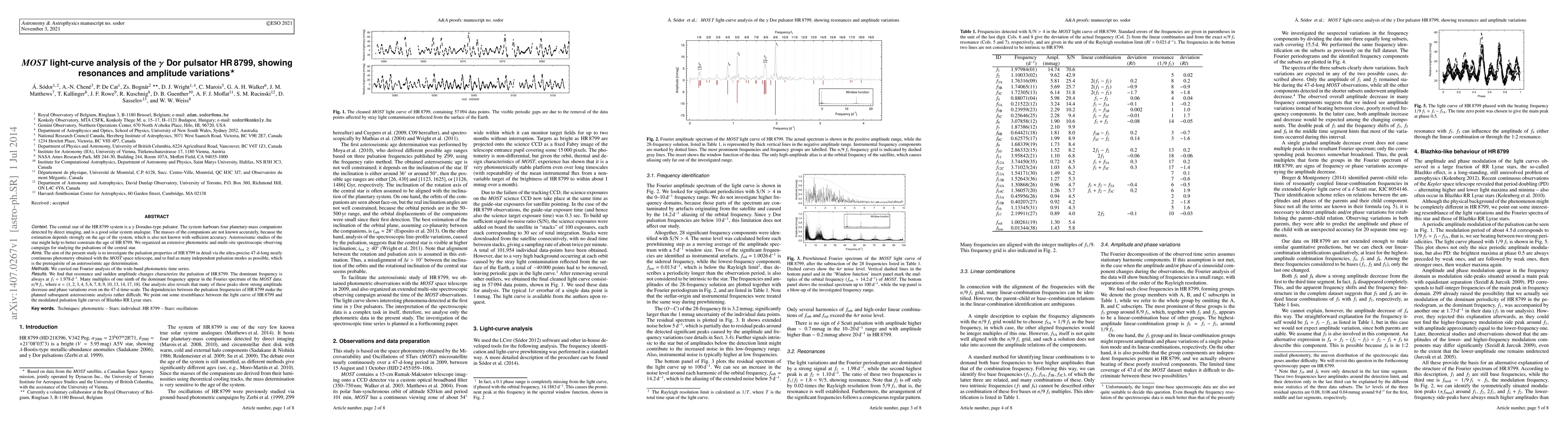Context: The central star of the HR 8799 system is a gamma Doradus-type pulsator. The system harbours four planetary-mass companions detected by direct imaging, and is a good solar system analogue. The masses of the companions are not known accurately, because the estimation depends strongly on the age of the system, which is also not known with sufficient accuracy. Asteroseismic studies of the star might help to better constrain the age of HR 8799. We organized an extensive photometric and multi-site spectroscopic observing campaign for studying the pulsations of the central star. Aims: The aim of the present study is to investigate the pulsation properties of HR 8799 in detail via the ultra-precise 47-d-long nearly continuous photometry obtained with the MOST space telescope, and to find as many independent pulsation modes as possible, which is the prerequisite of an asteroseismic age determination. Methods: We carried out Fourier analysis of the wide-band photometric time series. Results: We find that resonance and sudden amplitude changes characterize the pulsation of HR 8799. The dominant frequency is always at f1 = 1.978 c/d. Many multiples of one ninth of the dominant frequency appear in the Fourier spectrum of the MOST data: n/9 f1, where n={1, 2, 3, 4, 5, 6, 7, 8, 9, 10, 13, 14, 17, 18}. Our analysis also reveals that many of these peaks show strong amplitude decrease and phase variations even on the 47-d time-scale. The dependencies between the pulsation frequencies of HR 8799 make the planned subsequent asteroseismic analysis rather difficult. We point out some resemblance between the light curve of HR 8799 and the modulated pulsation light curves of Blazhko RR Lyrae stars.