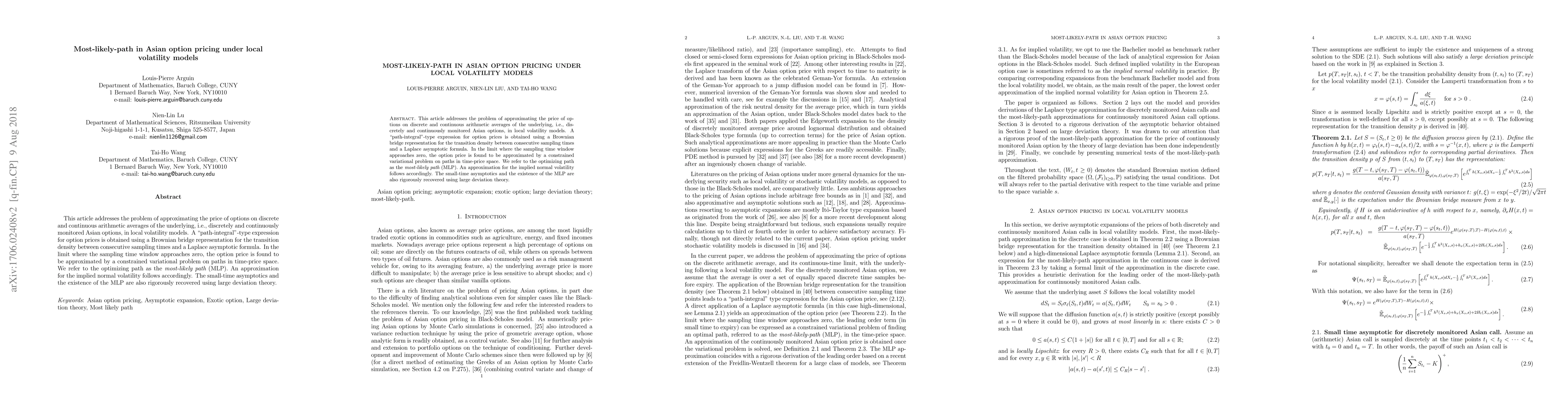 This paper develops an approximation method for pricing Asian options under local volatility models, identifying a most-likely path (MLP) that optimizes the option price through a constrained variational problem. The method uses a Brownian bridge representation and large deviation theory to derive the small-time asymptotics and implied normal volatility.