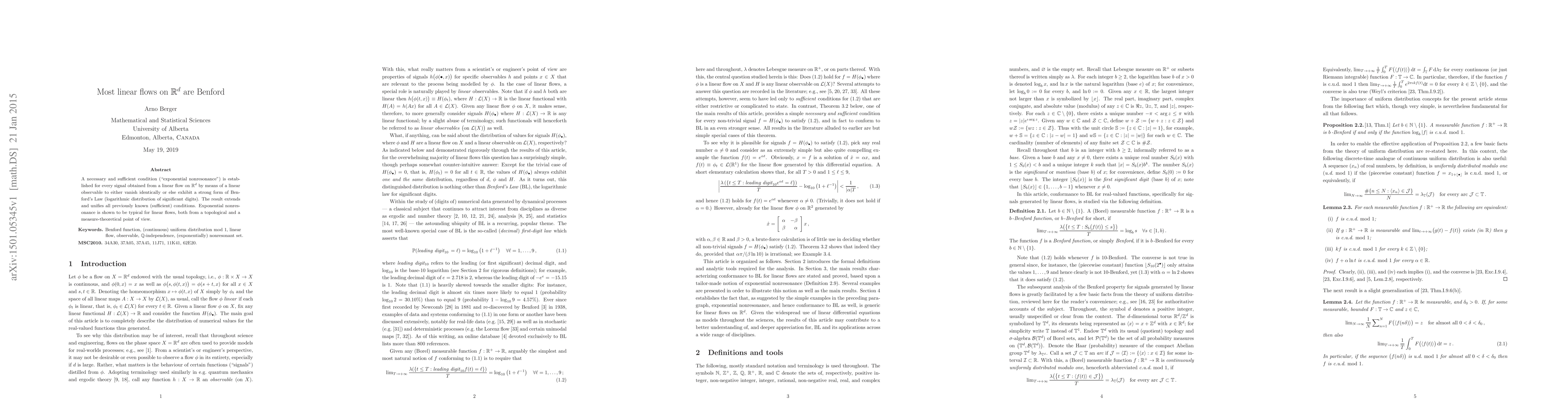 A necessary and sufficient condition ("exponential nonresonance") is established for every signal obtained from a linear flow on $\mathbb{R}^d$ by means of a linear observable to either vanish identically or else exhibit a strong form of Benford's Law (logarithmic distribution of significant digits). The result extends and unifies all previously known (sufficient) conditions. Exponential nonresonance is shown to be typical for linear flows, both from a topological and a measure-theoretical point of view.
