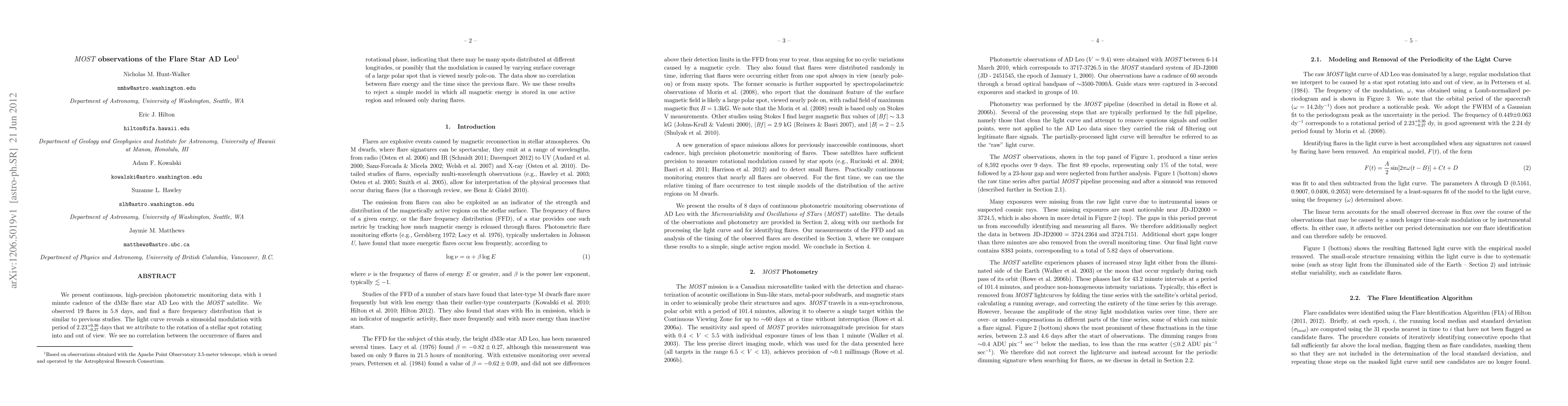 This paper reports high-precision observations of the flare star AD Leo using the MOST satellite, revealing 19 flares over 5.8 days and a rotational modulation period of 2.23 days likely due to stellar spots. No correlation between flare occurrence and rotational phase suggests multiple distributed spots or a large polar spot.