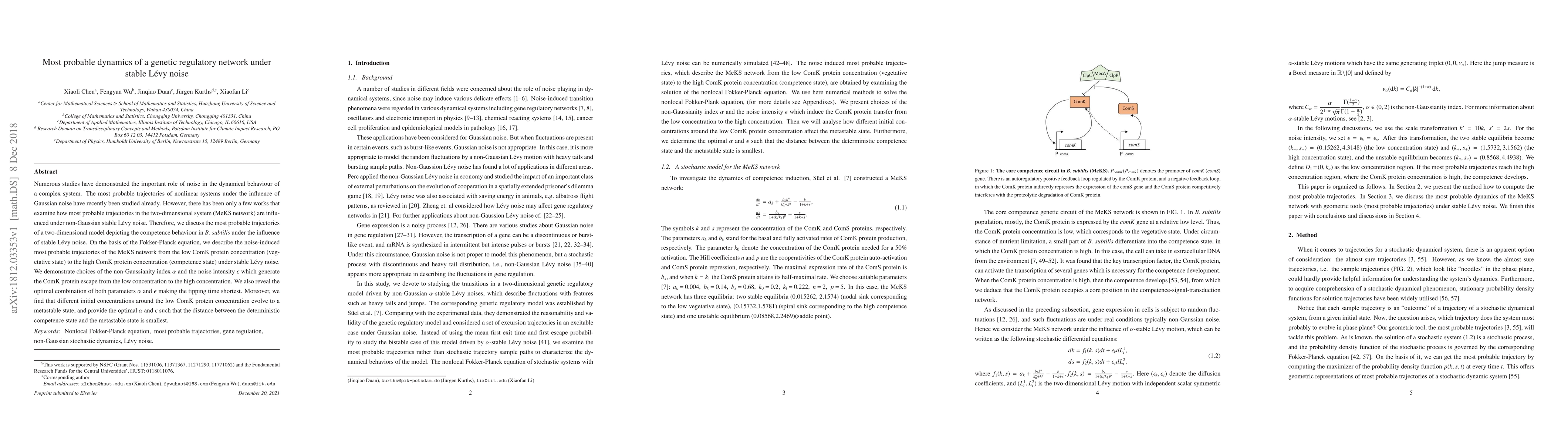 Numerous studies have demonstrated the important role of noise in the dynamical behaviour of a complex system. The most probable trajectories of nonlinear systems under the influence of Gaussian noise have recently been studied already. However, there has been only a few works that examine how most probable trajectories in the two-dimensional system (MeKS network) are influenced under non-Gaussian stable L\'evy noise. Therefore, we discuss the most probable trajectories of a two-dimensional model depicting the competence behaviour in B. subtilis under the influence of stable L\'evy noise. On the basis of the Fokker-Planck equation, we describe the noise-induced most probable trajectories of the MeKS network from the low ComK protein concentration (vegetative state) to the high ComK protein concentration (competence state) under stable L\'evy noise. We demonstrate choices of the non-Gaussianity index $\alpha$ and the noise intensity $\epsilon$ which generate the ComK protein escape from the low concentration to the high concentration. We also reveal the optimal combination of both parameters $\alpha$ and $\epsilon$ making the tipping time shortest. Moreover, we find that different initial concentrations around the low ComK protein concentration evolve to a metastable state, and provide the optimal $\alpha$ and $\epsilon$ such that the distance between the deterministic competence state and the metastable state is smallest.