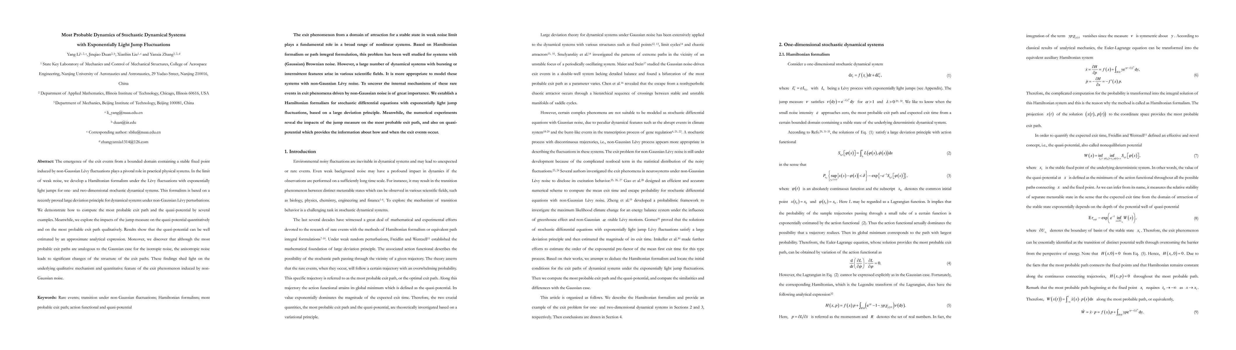 This paper develops a Hamiltonian formalism for stochastic dynamical systems under exponentially light jump fluctuations, revealing the most probable exit paths from a bounded domain. The study highlights the impact of anisotropic noise on the exit paths, showing significant structural changes compared to the Gaussian case, and provides an approximate analytical expression for the quasi-potential.