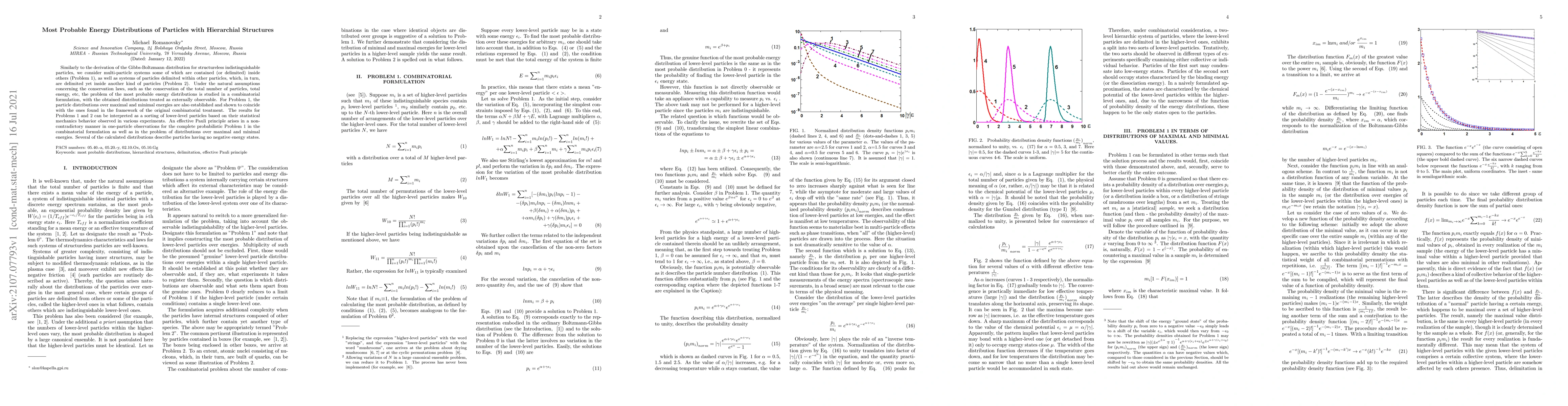 Similarly to the derivation of the Gibbs-Boltzmann distribution for structureless indistinguishable particles, we consider multi-particle systems some of which are contained (or delimited) inside others (Problem 1), as well as systems of particles delimited within other particles, which, in turn, are delimited yet inside another kind of particles (Problem 2). Under the natural assumptions concerning the conservation laws, such as the conservation of the total number of particles, total energy, etc, the problem of the most probable energy distributions is studied in a combinatorial formulation, with the obtained distributions treated as externally observable. For Problem 1, the particle distributions over maximal and minimal energies are also established and shown to coincide with the ones found in the framework of the original combinatorial treatment. The results for Problems 1 and 2 can be interpreted as a sorting of lower-level particles based on their statistical mechanics behavior observed in various experiments. An effective Pauli principle arises in a non-contradictory manner in one-particle observations for the complete probabilistic Problem 1 in the combinatorial formulation as well as in the problem of distributions over maximal and minimal energies. Several of the calculated distributions describe particles having no negative energy states.