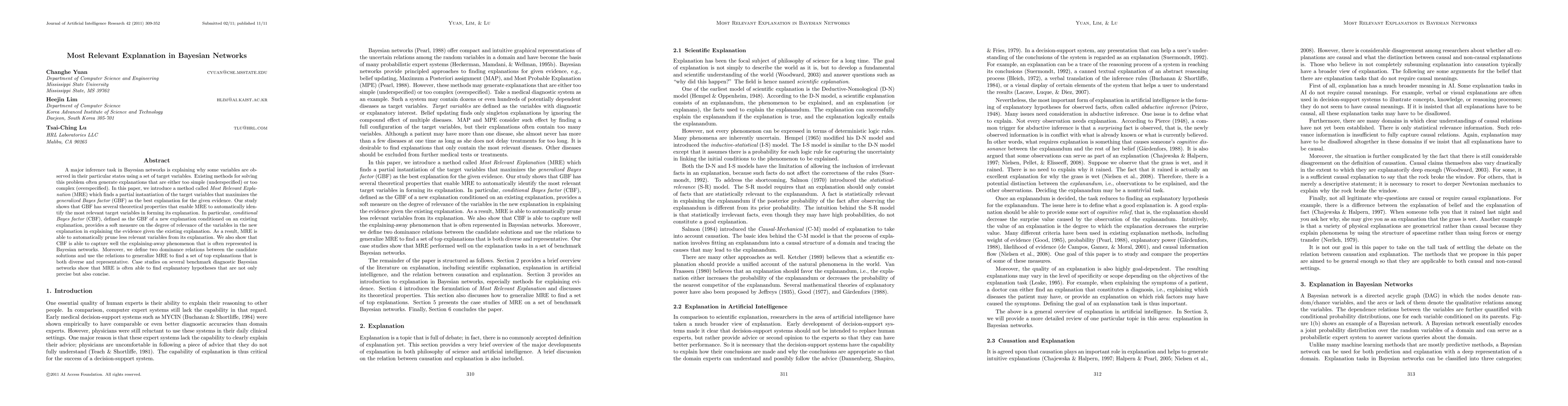 This paper introduces the Most Relevant Explanation (MRE) method for Bayesian networks, which finds the optimal subset of target variables that best explains observed states by maximizing the generalized Bayes factor (GBF). The method effectively prunes irrelevant variables using conditional Bayes factor (CBF) to achieve concise and precise explanations, capturing the explaining-away phenomenon and generating diverse, representative sets of top explanations.